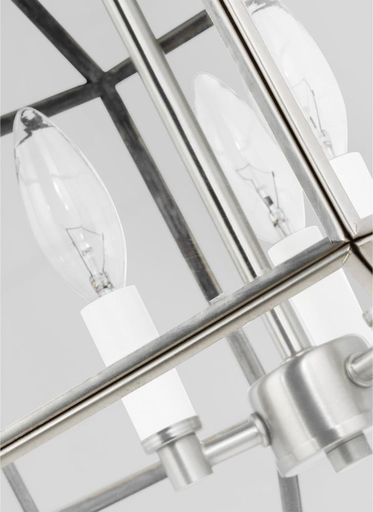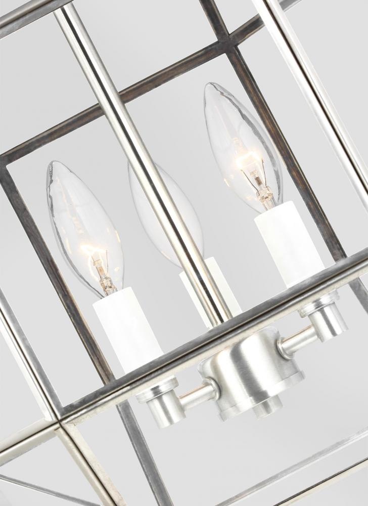The Morrison three light indoor pendant in brushed nickel enhances the beauty of your home with ample light and style to match today's trends. A lantern-like design with curved arms connecting to a cube-shaped frame