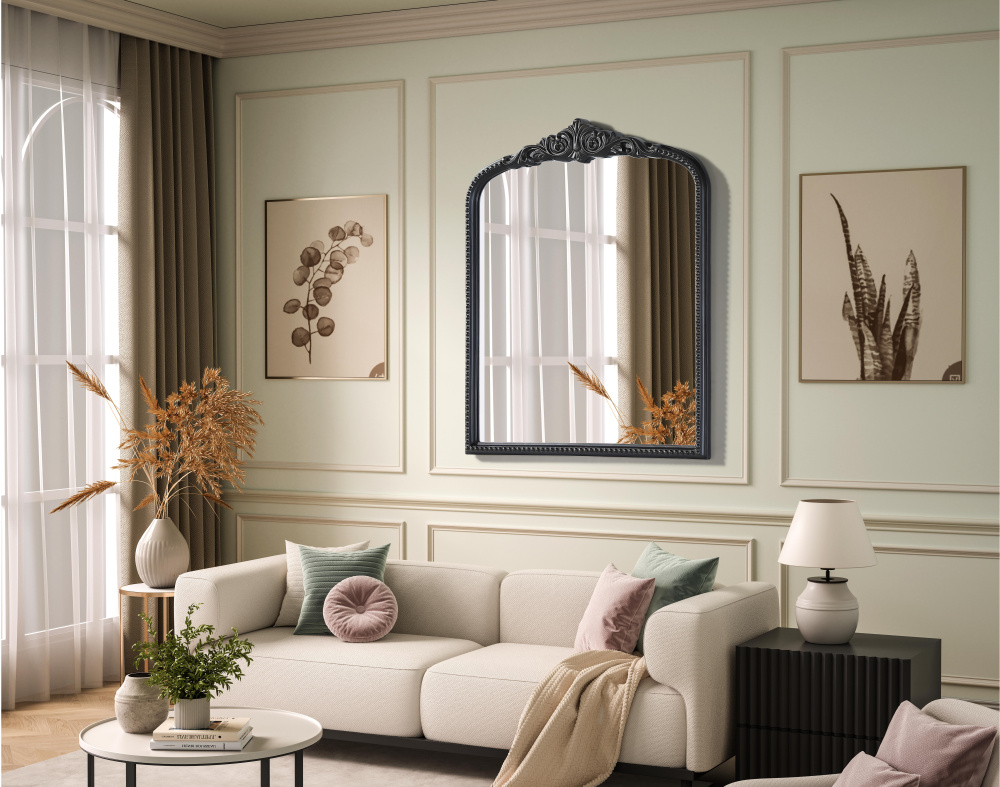 Bring classic charm and vintage character to your home with this arched wall mirror in a distressed vintage bronze finish. The hand-painted frame showcases ornate scroll and floral detailing, creating a refined, old-world aesthetic. Crafted from resin with an MDF backing board, this mirror is lightweight yet durable. Designed for vertical hanging only, it includes two metal inset hangers for easy installation (hardware not included). Whether placed above a fireplace mantel, in an entryway, or as an accent piece in a living room, this mirror enhances the space with its architectural beauty. Available in multiple sizes and an alternative antique brass finish, it is a versatile addition to classic, vintage, or French-inspired interiors.