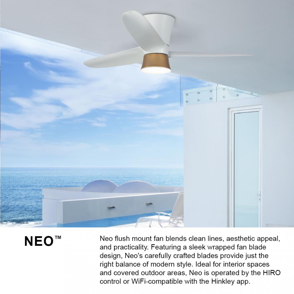 Neo flush mount fan blends clean lines, aesthetic appeal, and practicality. Featuring a sleek wrapped fan blade design in Matte Black or Matte White to provide just the right balance of modern style. Ideal for interior spaces and covered outdoor areas, Neo incorporates integrated LED and DC motor technology to deliver excellent energy efficiency. Operated by the HIRO control or WiFi- compatible with the Hinkley app.