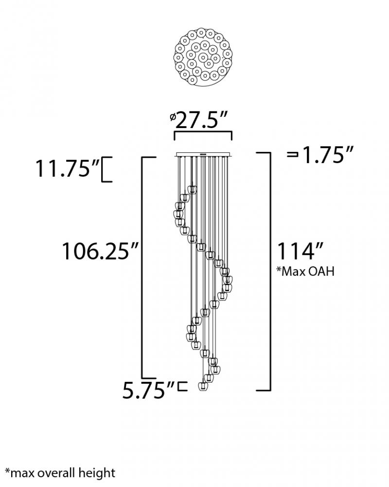 Clear apple shaped glass rest on machined aluminum fonts finished in Satin Brass with integrated LED for even Illumination without the glare. The large scale 25 light comes pre-arranged for ease of installation and is perfect for that tall ceiling applicat