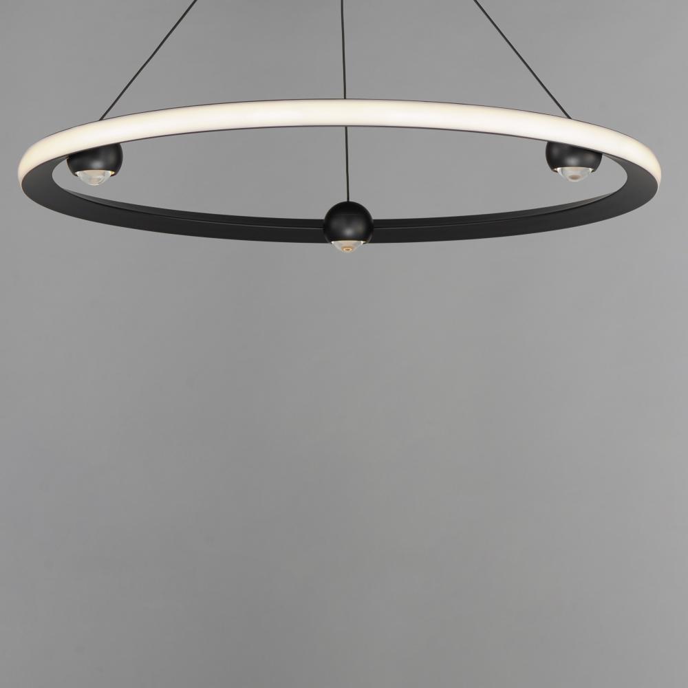 Introducing a new take on the now classically modern LED ring, large illuminated spheres act as "nodes" to support the tapered aluminum channel while also providing additional down light. Featuring a CCT selectable switch, the collection convenient
