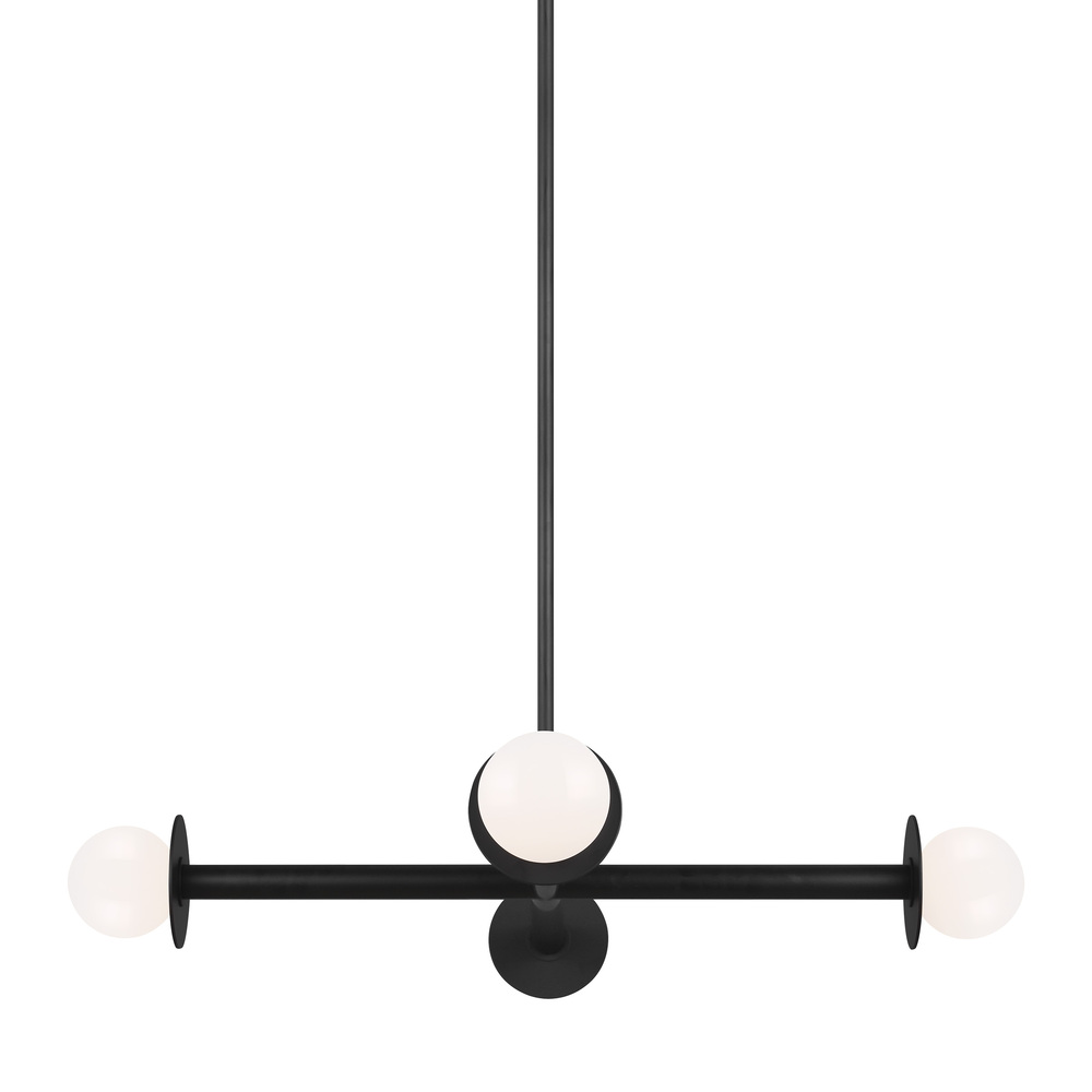 The Nodes four light single tier wide chandelier by Kelly Wearstler enhances the beauty of your home with ample light and style to match today's trends. Nodes task, ceiling and wall lighting is minimal yet bold, highlighting Kelly's distinctive juxtaposition of mixed-materiality and curvilinear form. Light radiates from milk glass globes set against metal discs. All fixtures can be used or without the discs. The cast canopy is available in Burnished Brass or Midnight Black. Hanging fixtures within this family feature black fabric cords, while pivot sconces can be cord and plug or hard wire.