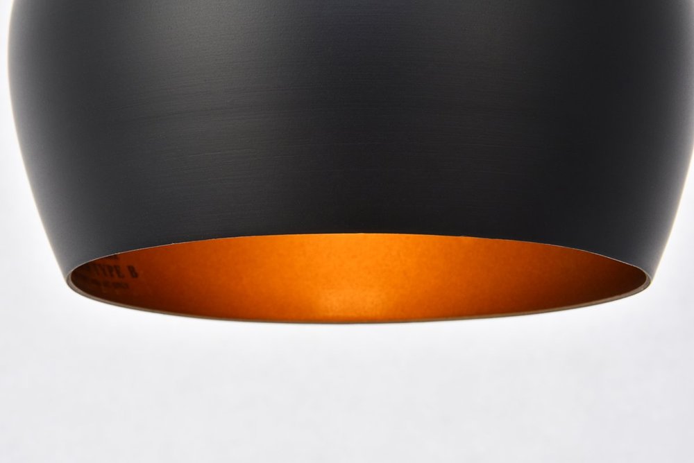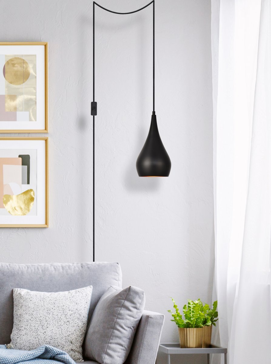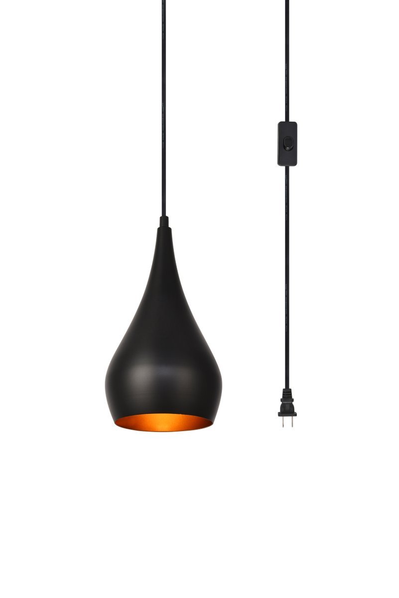 Set the right mood in a kitchen, office, or bedroom with Nora collection hanging lights. Sleek teardrop shaped aluminum shades come in a sexy matte-black finish. Contrasting vintage brass finish on the inside of the shade gives these pendant lamps just the right amount of attitude. Plug-in design for easy access lighting with built-in on/off switch. Simply hang this piece on the provided swag hooks and plug it in for an effortlessly easy installation - can be hung from a sloped or vaulted ceiling.