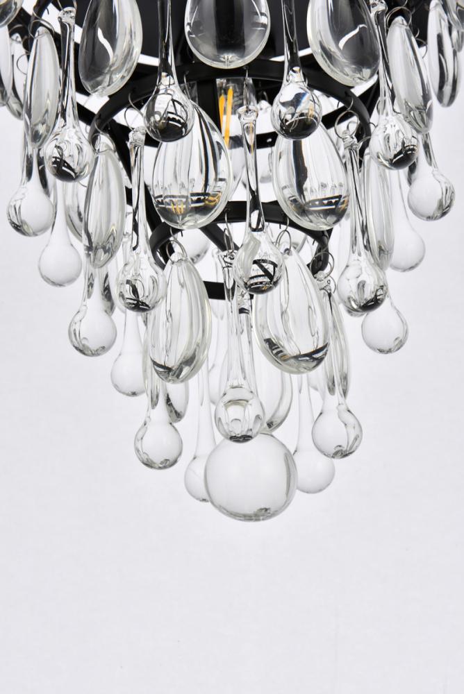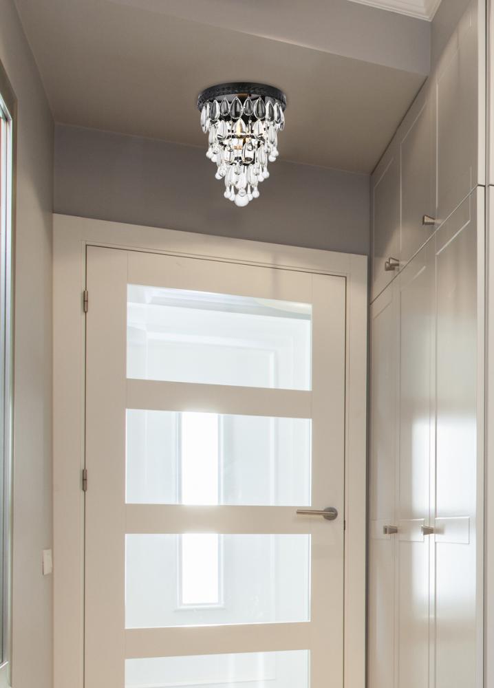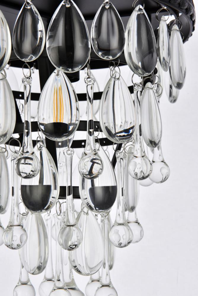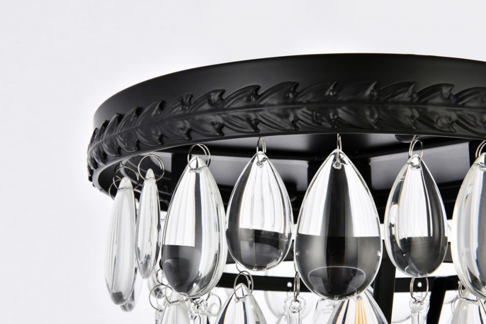 Like icicles reflecting the winter sun, Nordic flush-mount fixtures glisten with royal-cut clear crystal drops illuminated by the soft glow of candelabras. An etched frame base of black bands the descending tiers of icy crystals.