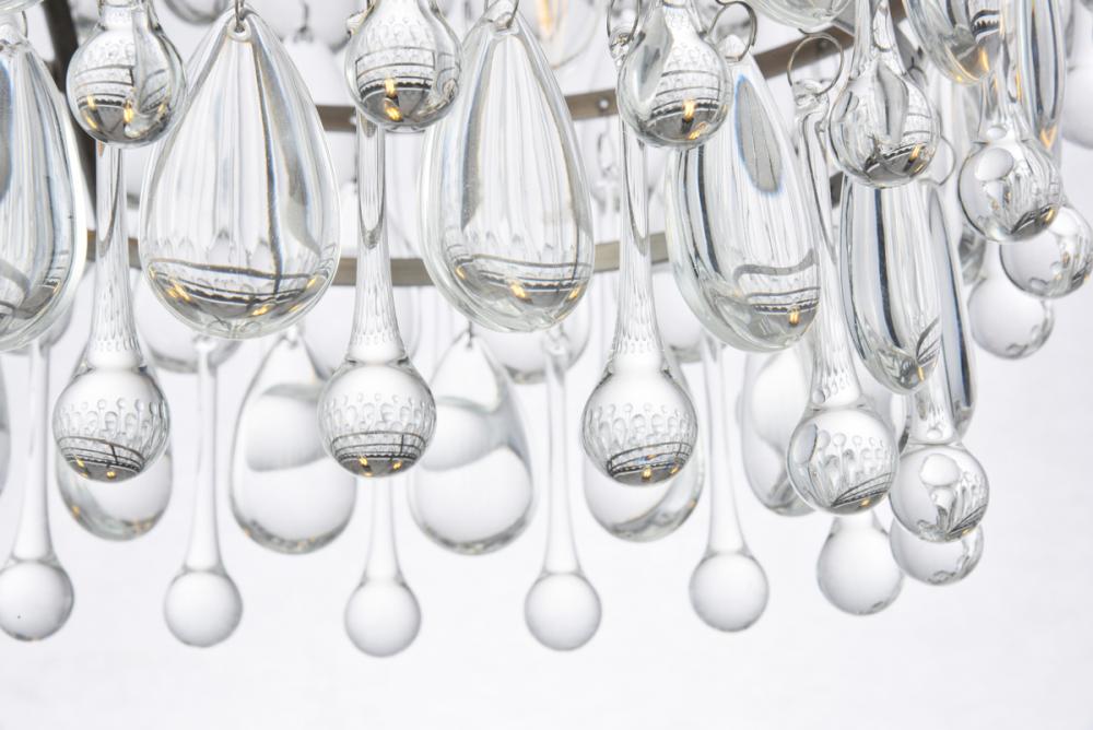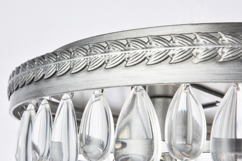 Like icicles reflecting the winter sun, Nordic flush-mount fixtures glisten with royal-cut clear crystal drops illuminated by the soft glow of candelabras. An etched frame base of antique silver bands the descending tiers of icy crystals.