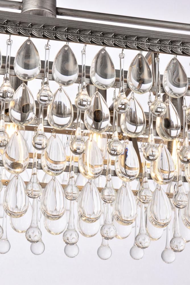 Like the sun setting on a frozen lake, this collection shimmers with tiers of icy crystals reflecting the soft glow of the candelabras. True to its Nordic namesake, the cascades of clear crystals complement the etched metal frame. Suspended by an elegantly looped chain that draws the eye to the cool sheen below. Perfect to place over your dining table.