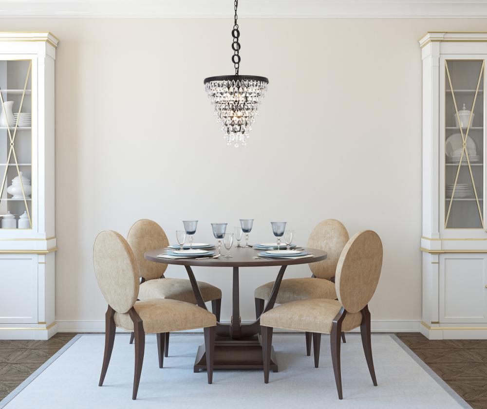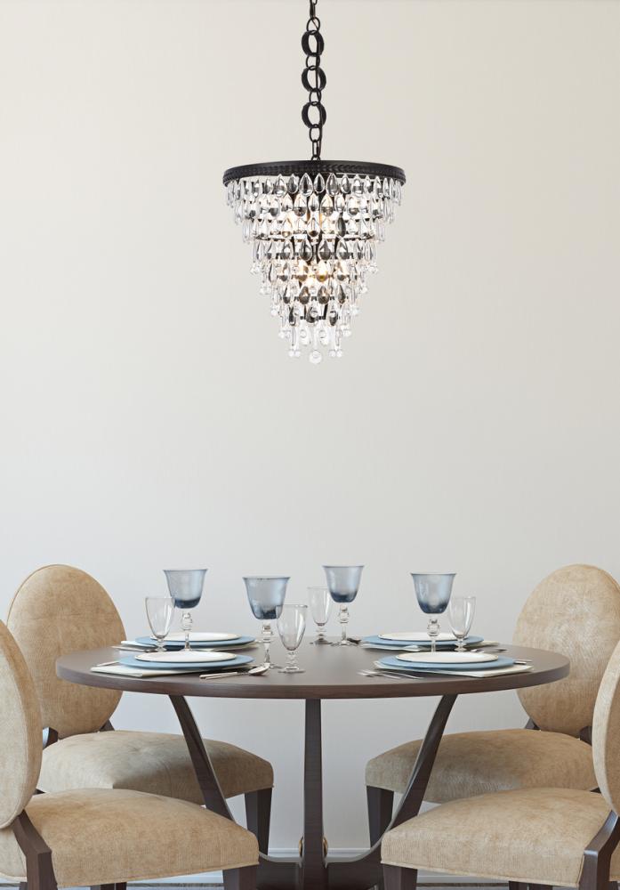 Tiers of royal-cut clear crystals reflect the soft-glow of 5 candelabra bulbs