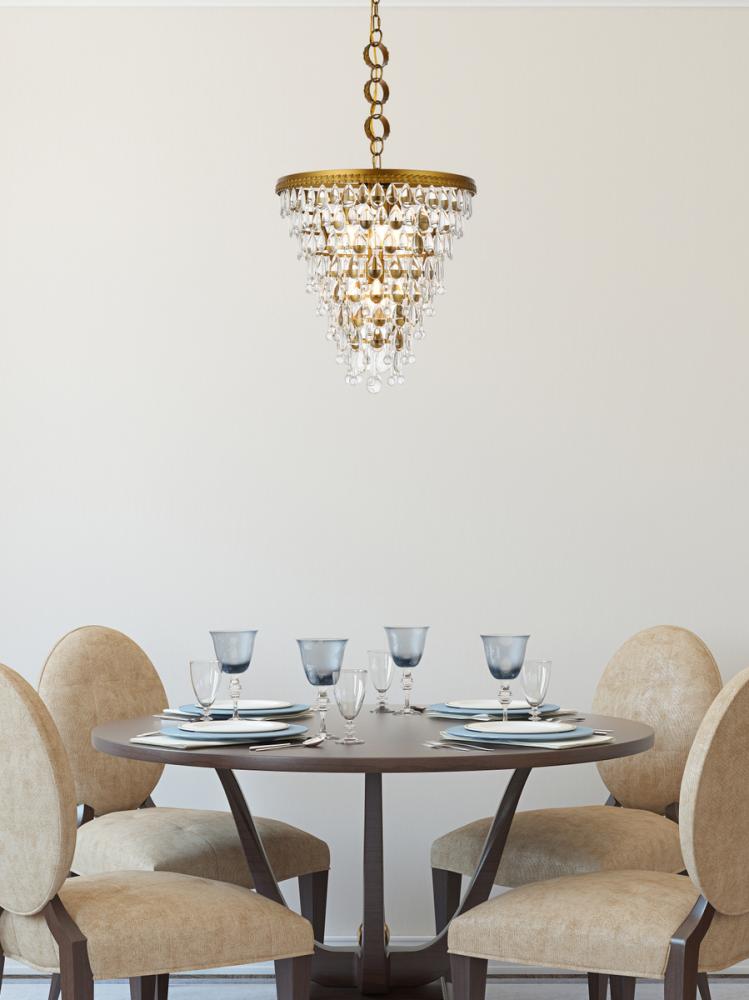 Tiers of royal-cut clear crystals reflect the soft-glow of 5 candelabra bulbs