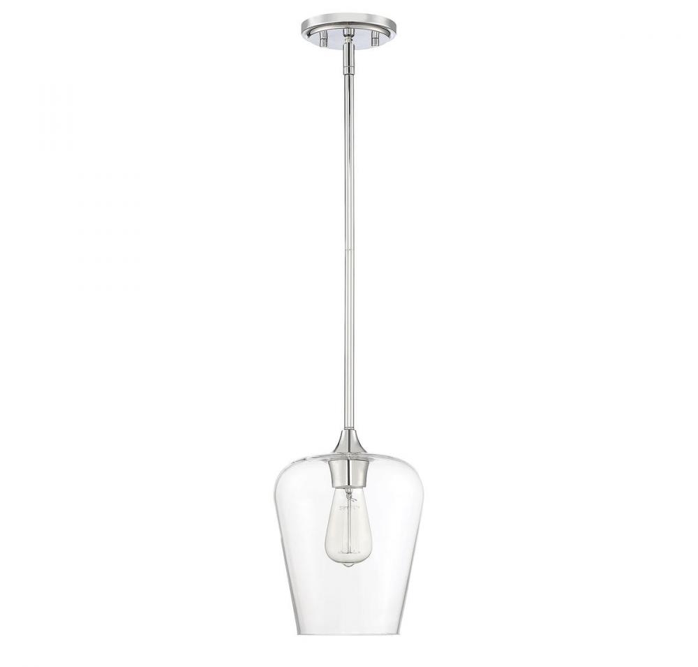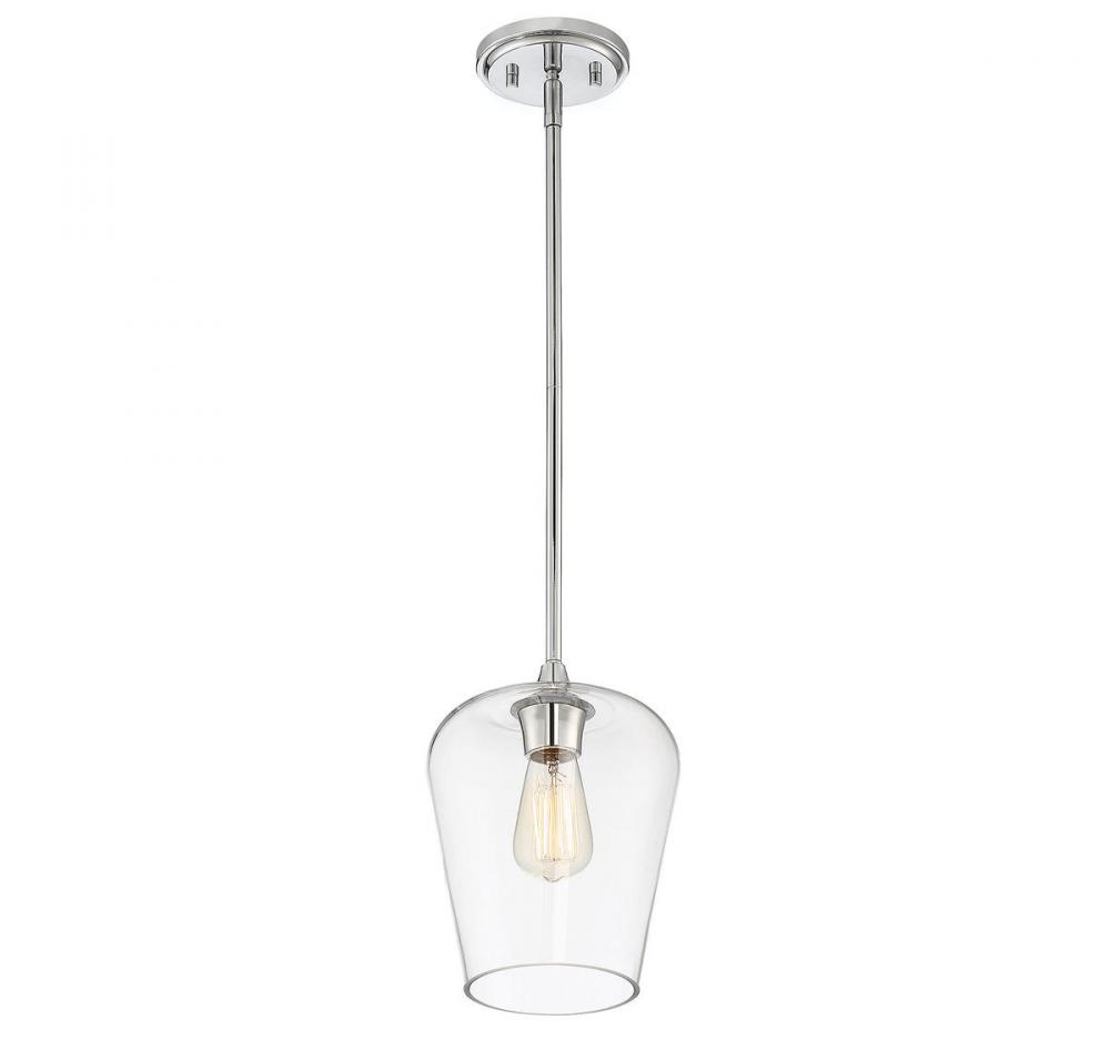 Get a pendant look with understated elegance when you get the Savoy House Octave 1-light pendant. It features a shade of curved clear glass, minimal detailing and a sleek polished chrome finish. Pendants are extremely versatile and can fit in many different spaces, such as kitchens, family rooms, great rooms, foyers, entryways, offices, bedrooms and bathrooms. The hanging height is adjustable and this pendant can be used on a sloped ceiling. Since the bulb is exposed, try using a stylized bulb (not included) like Edison style for a different twist! The chrome finish can be paired with chrome hardware or mixed with hardware in other finishes. Try the Octave with glam, transitional or contemporary style rooms for a chic look. When you choose a Savoy House lighting fixture, you can be certain you've selected a piece that will withstand the test of time.