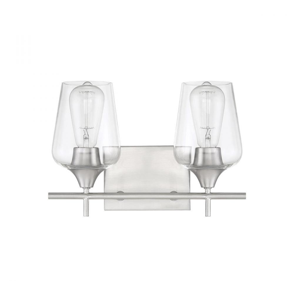 Bold, light-colored lines and a streamlined silhouette create an air of elegance and sophistication. The lustrous, brushed, satin nickel finish and clear glass shades go with absolutely everything: any color palette and many other finishes. Whether you have transitional, contemporary, bohemian, or other decor styles in your bath, you’ll love the way this Octave fixture stylishly blends in. The bath bar is 14” wide, 9” high, and extends 5.5” from the wall. The curved glass shades have a graceful, uncluttered look, and two 60W, E-style bulbs provide lovely light above the vanity. Plus, it may be mounted as either uplight, or downlight —a sleek, clean choice for your bathroom or powder room.