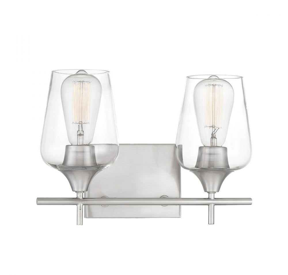 In the Savoy House Octave 2-light bath bar, bold light-colored lines and a streamlined silhouette create an air of elegance and sophistication. The satin nickel finish and clear glass shades go with absolutely everything. Whether you have transitional, contemporary, bohemian or other decor styles in your bath, you’ll love the way this Octave fixture stylishly blends in. The bath bar is 13.75" wide, 9.5" high and extends 5.5" from the wall. The curved glass shades have a graceful, uncluttered look and two 60W standard size bulbs provide lovely light above the vanity. Plus, it may be mounted as either uplight or downlight, creating a sleek and clean choice for your bathroom or powder room.