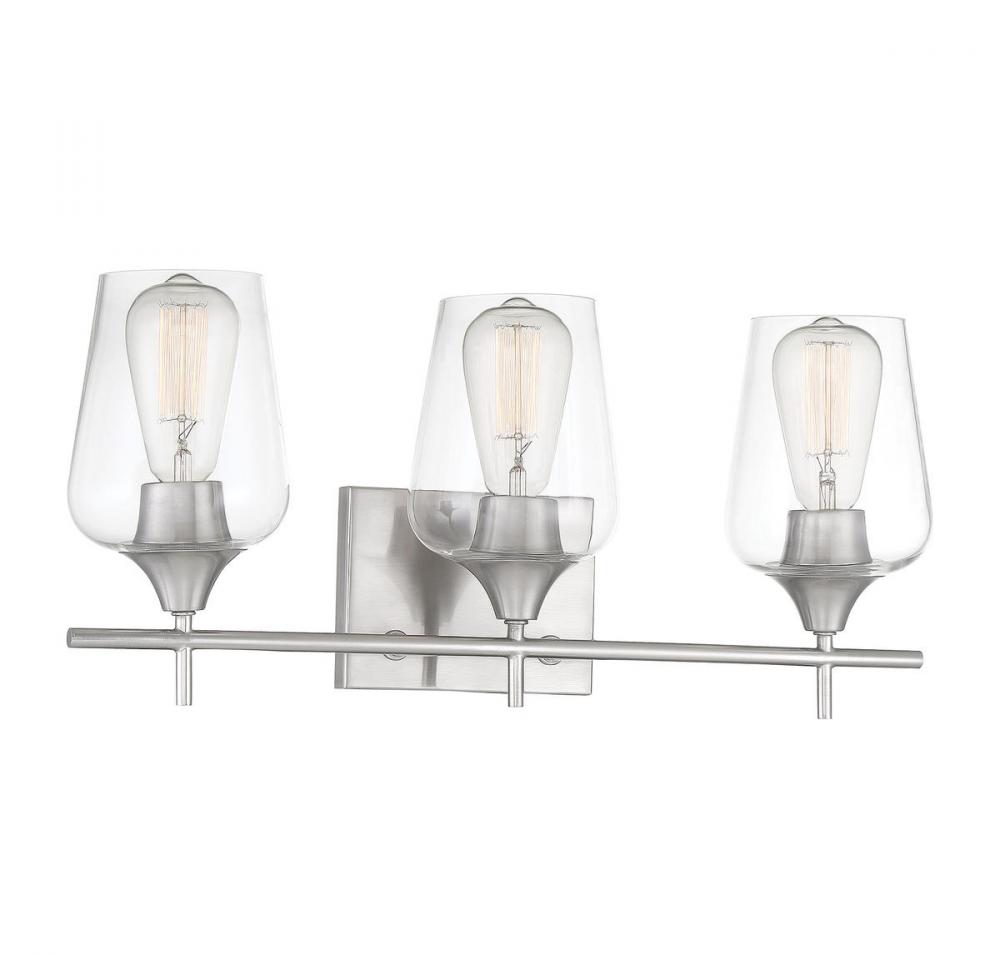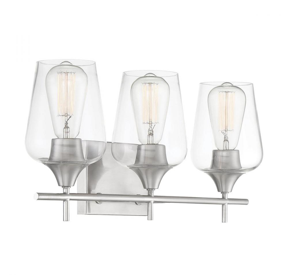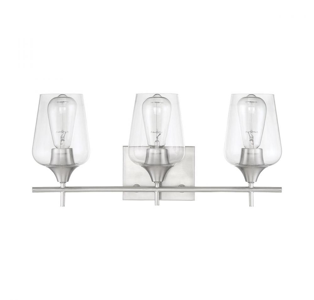 In the Savoy House Octave 3-light bath bar, bold light-colored lines and a streamlined silhouette create an air of elegance and sophistication. The satin nickel finish and clear glass shades go with absolutely everything. Whether you have transitional, contemporary, bohemian or other decor styles in your bath, you’ll love the way this Octave fixture stylishly blends in. The bath bar is 21" wide, 9.5" high and extends 5.5" from the wall. The curved glass shades have a graceful, uncluttered look and three 60W standard size bulbs provide lovely light above the vanity. Plus, it may be mounted as either uplight or downlight, creating a sleek and clean choice for your bathroom or powder room.