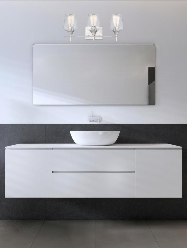 Bold, light-colored lines and a streamlined silhouette create an air of elegance and sophistication. The lustrous, brushed, satin nickel finish and clear glass shades go with absolutely everything: any color palette and many other finishes. Whether you have transitional, contemporary, bohemian, or other decor styles in your bath, you’ll love the way this Octave fixture stylishly blends in. The bath bar is 21” wide, 9” high, and extends 5.5” from the wall. The curved glass shades have a graceful, uncluttered look, and three 60W, E-style bulbs provide lovely light above the vanity. Plus, it may be mounted as either uplight, or downlight —a sleek, clean choice for your bathroom or powder room.