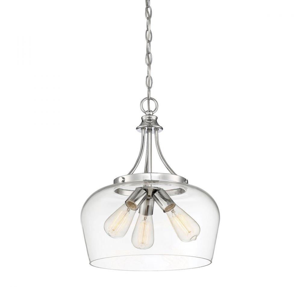 Get a pendant look with understated elegance when you get the new Savoy House Octave 3-light pendant. It features a single large shade of curved clear glass, minimal detailing and a sleek polished chrome finish. Pendants are extremely versatile and can fit in many different spaces, such as kitchens, family rooms, great rooms, foyers, entryways, offices, bedrooms and bathrooms. Because this pendant is chain-hung, you can use as much or as little chain as you need to fit your specific hanging height needs, and this pendant can be used on a sloped ceiling. Since the bulbs are exposed, try using stylized bulbs (not included) like Edison style for a different twist! The polished chrome finish can be paired with chrome hardware or mixed with hardware in other finishes. Try the Octave with glam, transitional or contemporary style rooms for a chic look. When you choose a Savoy House lighting fixture, you can be certain you've selected a piece that will withstand the test of time.
