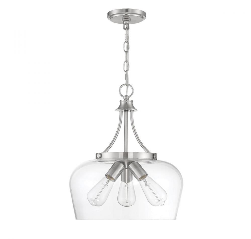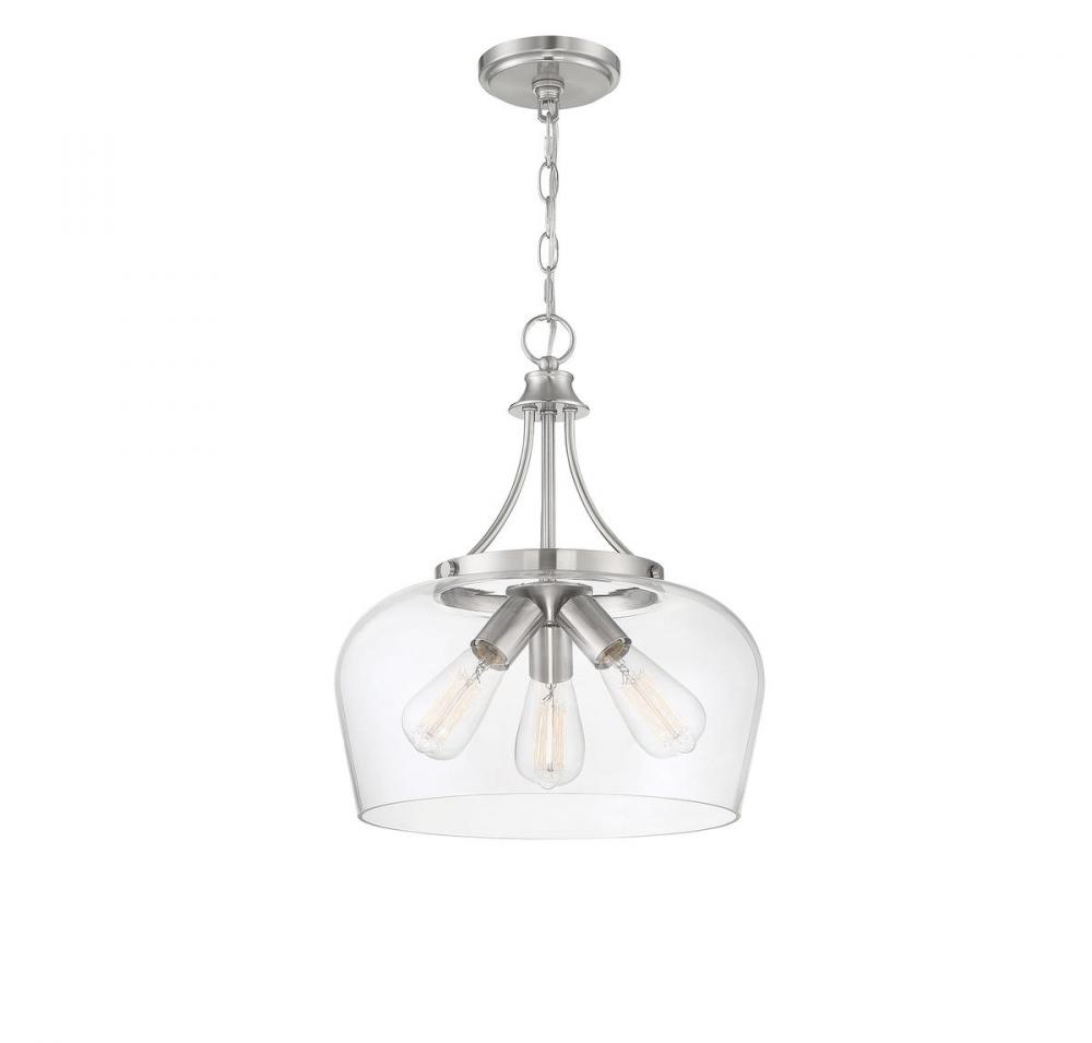 A bold, light-colored frame and streamlined silhouette create an air of elegance and sophistication. The lustrous, brushed, satin nickel finish and large, clear glass shade go with absolutely everything: any color palette and many other finishes. Whether you have transitional, contemporary, bohemian, or other decor styles in your home, you’ll love the way this Octave fixture stylishly blends in. And at 15” wide by 18” high, this pendant is a graceful, proportionate size —even when grouping a few together. The curved glass shade has a sleek, uncluttered look, and three 60W, E-style bulbs provide lovely light —for clean, casual style in your dining area, living room, kitchen, foyer, bedroom, bathroom, hallway, family room, office, great room, or stairway.