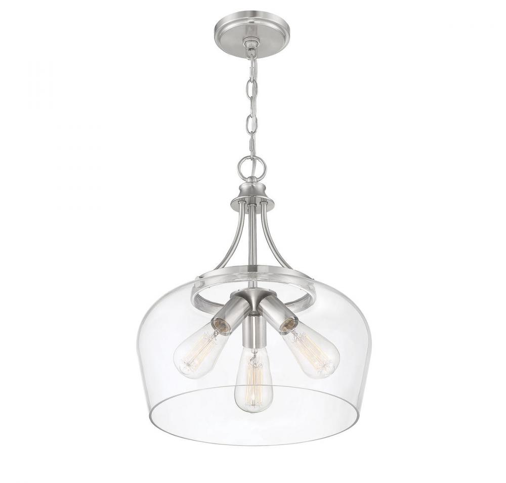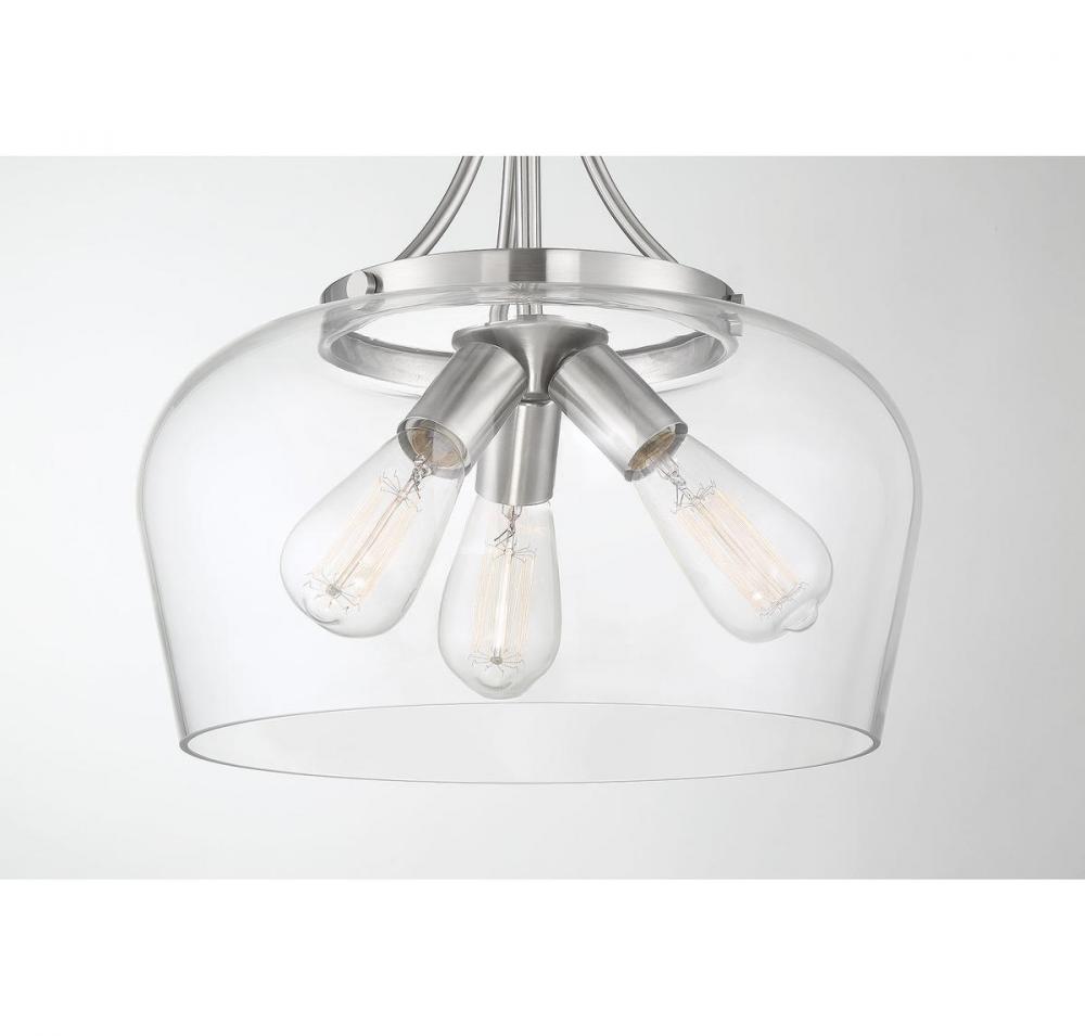 In the Savoy House Octave 3-light pendant, a bold, light-colored frame and streamlined silhouette create an air of elegance and sophistication. The satin nickel finish and large clear glass shade go with absolutely everything. Whether you have transitional, contemporary, bohemian or other decor styles in your home, you’ll love the way this Octave fixture stylishly blends in. At 15" wide by 18" high, this pendant is a perfectly graceful, proportionate size whether used solo or in groupings. The curved glass shade has a sleek, uncluttered look and three 60W standard size bulbs provide lovely light for clean, casual style in your dining area, living room, kitchen, foyer, bedroom, bathroom, hallway, family room, office, great room or stairway.