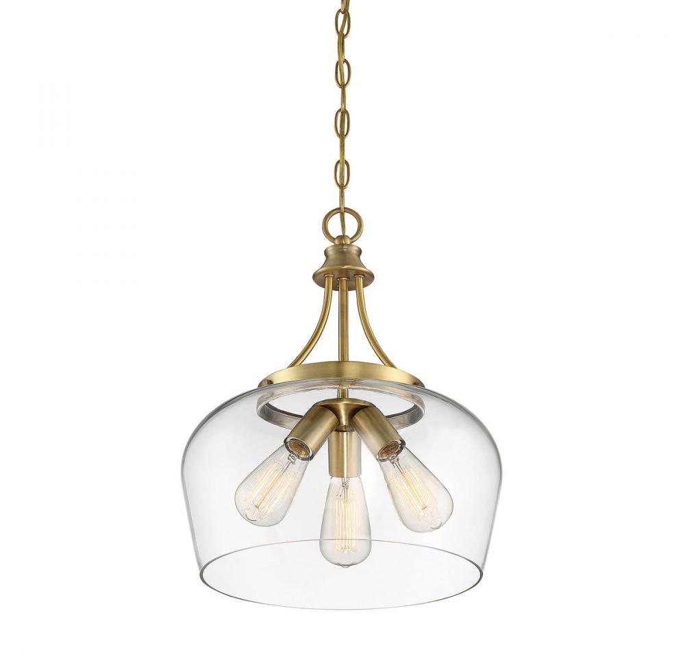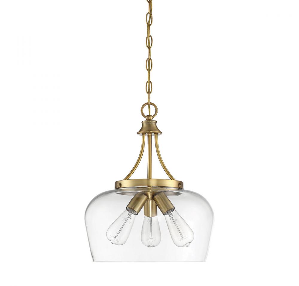 Get a pendant look with understated elegance when you get the new Savoy House Octave 3-light pendant. It features a single large shade of curved clear glass, minimal detailing and a rich warm brass finish. Pendants are extremely versatile and can fit in many different spaces, such as kitchens, family rooms, great rooms, foyers, entryways, offices, bedrooms and bathrooms. Because this pendant is chain-hung, you can use as much or as little chain as you need to fit your specific hanging height needs, and this pendant can be used on a sloped ceiling. Since the bulbs are exposed, try using stylized bulbs (not included) like Edison style for a different twist! The fashionable warm brass finish can be paired with brass hardware or mixed with hardware in other finishes. Try the Octave with glam, transitional or contemporary style rooms for a chic look. When you choose a Savoy House lighting fixture, you can be certain you've selected a piece that will withstand the test of time.