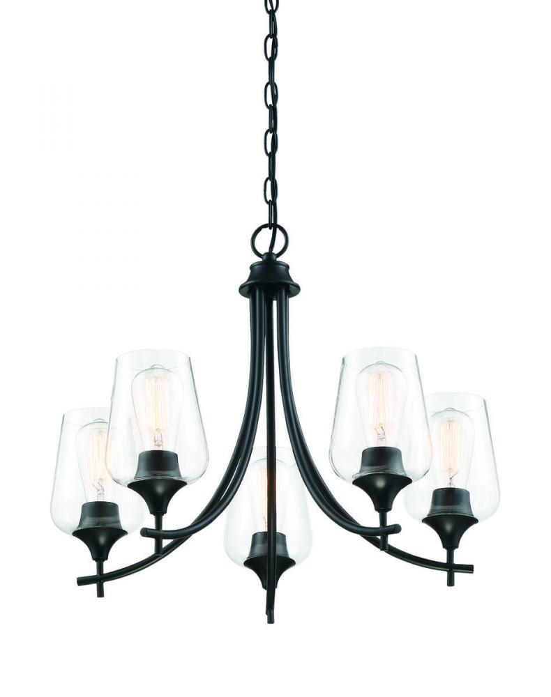 Bold black lines and a streamlined silhouette create an air of elegance and sophistication. The matte black finish and clear glass shades go with absolutely everything: any color palette, other finishes, and many different decor styles. If you have traditional, contemporary, transitional, vintage, modern farmhouse, industrial-inspired, or an eclectic mix in your home, you’ll love the way this Octave chandelier will stylishly fit right in. 23” wide by 18.5” high fixture connects with a chain to adjust hanging height. Curved arms hold curved glass shades for a graceful, uncluttered look. And five 60W bulbs will provide lovely illumination in your space, whether in a dining area, living room, entryway, or bedroom.