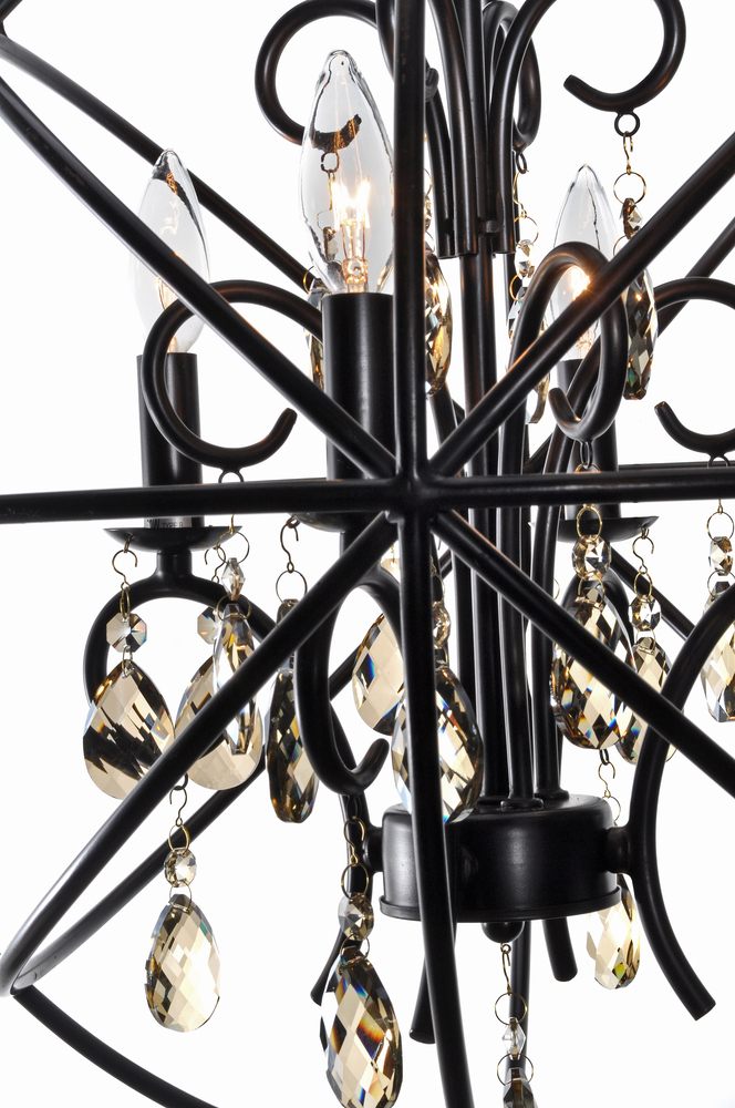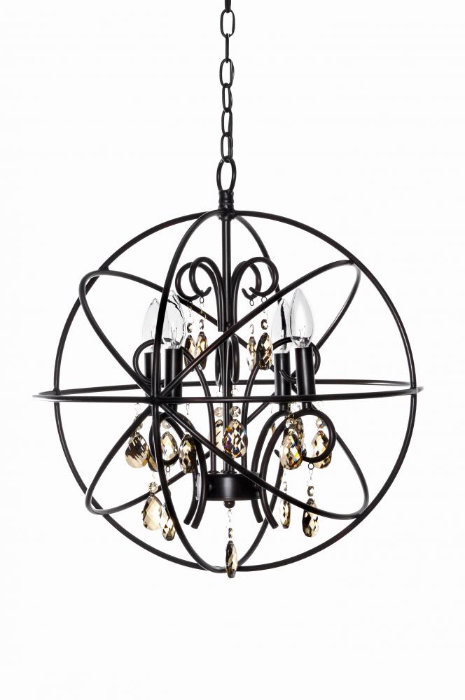 A spherical frame of metal surround a simple line chandelier draped in crystal for a transitional style that fits any interior design. Orbit is available in 2 sizes and 2 finishes, Oil Rubbed Bronze with Cognac crystal and a combo finish of Anthracite and