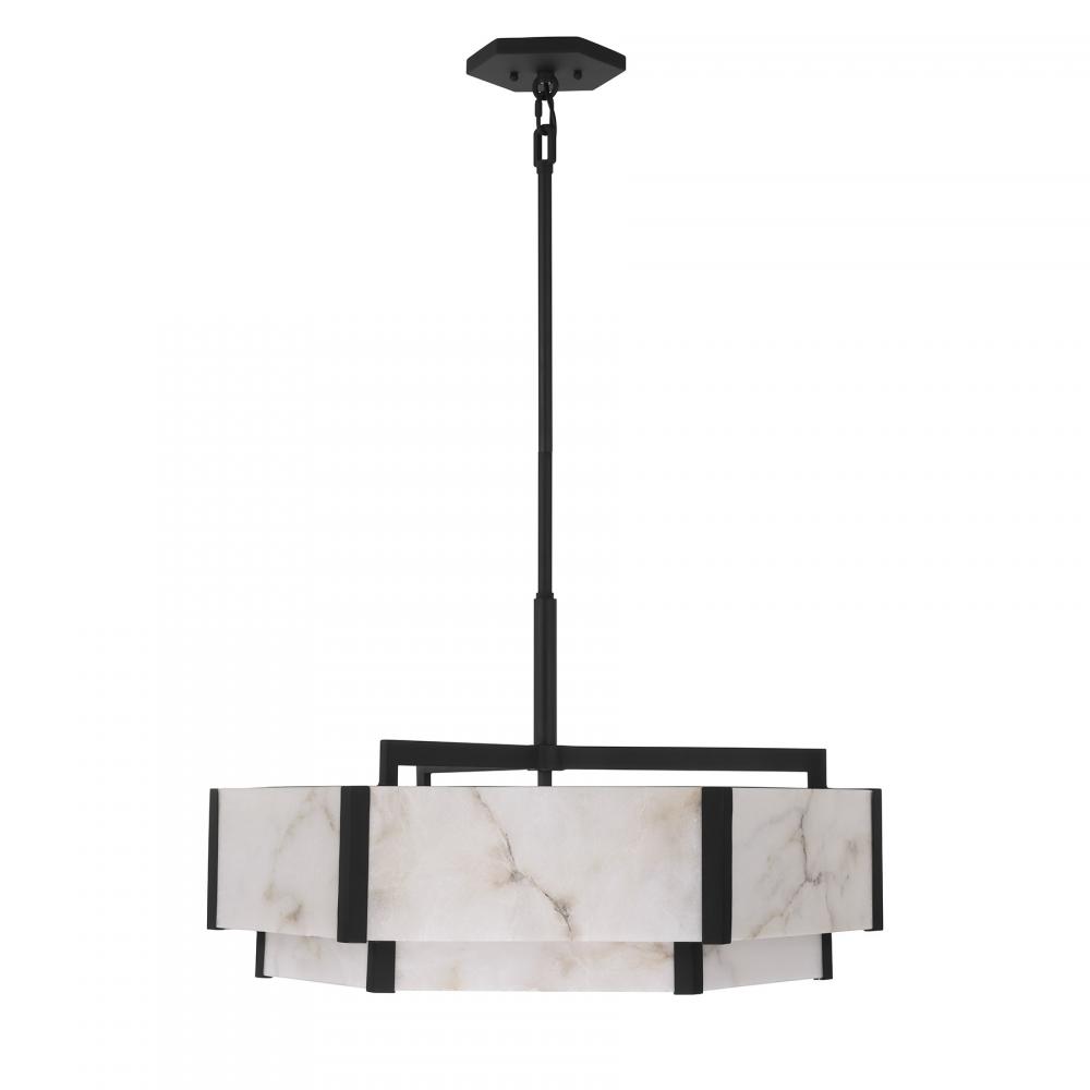 Art Deco style gets an organic twist in the Savoy House Orleans 6-light pendant. Panes of natural alabaster stone obscure the lights for a bright yet comfortable glow and are held in a jewelry-like frame that is finished in Black Cashmere. Orleans is 15.5" in height and 24.28" in width. It uses 6 candelabra size bulbs of up to 60 watts each (bulbs not included). Comes with four 12" downrods and one 6" downrod.