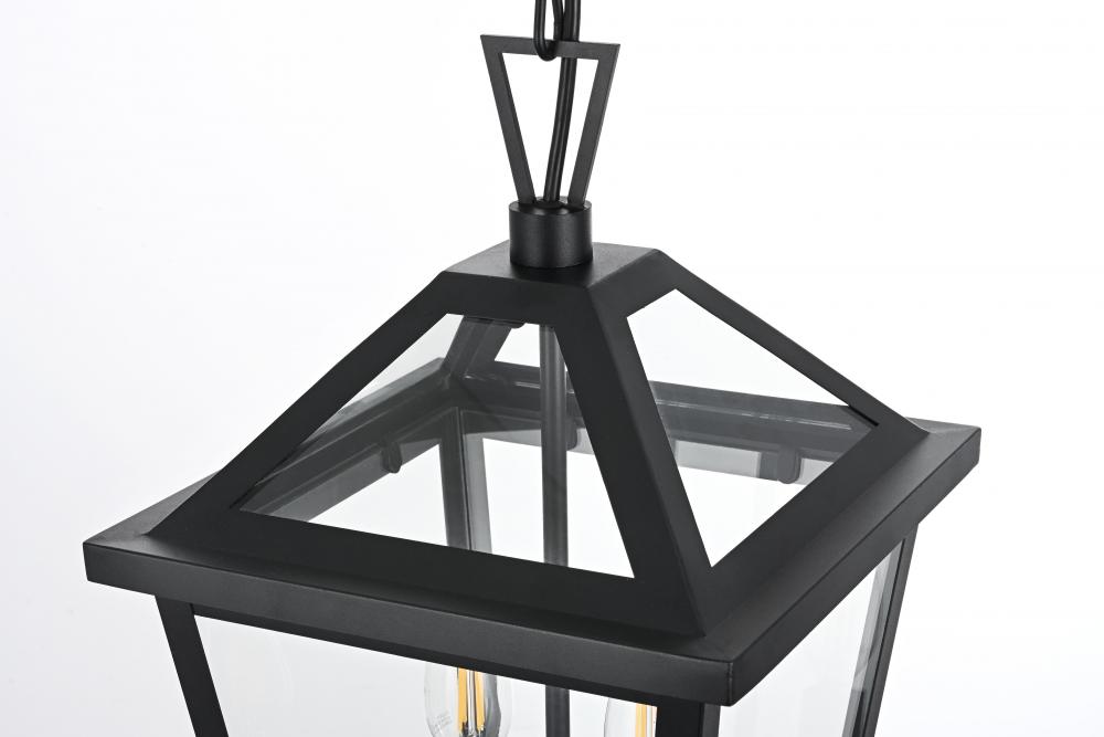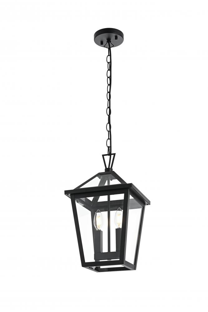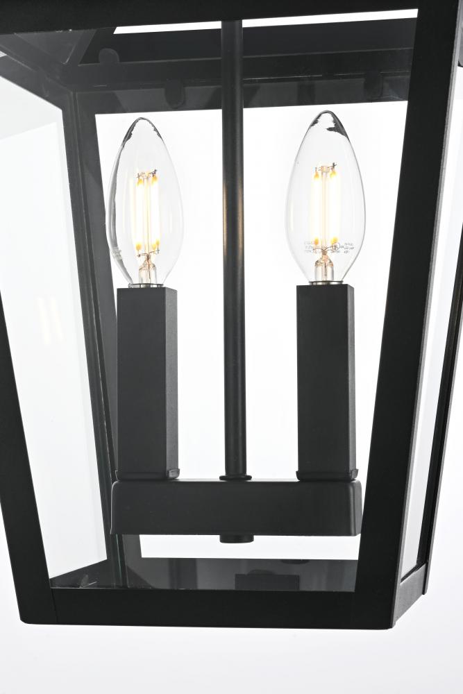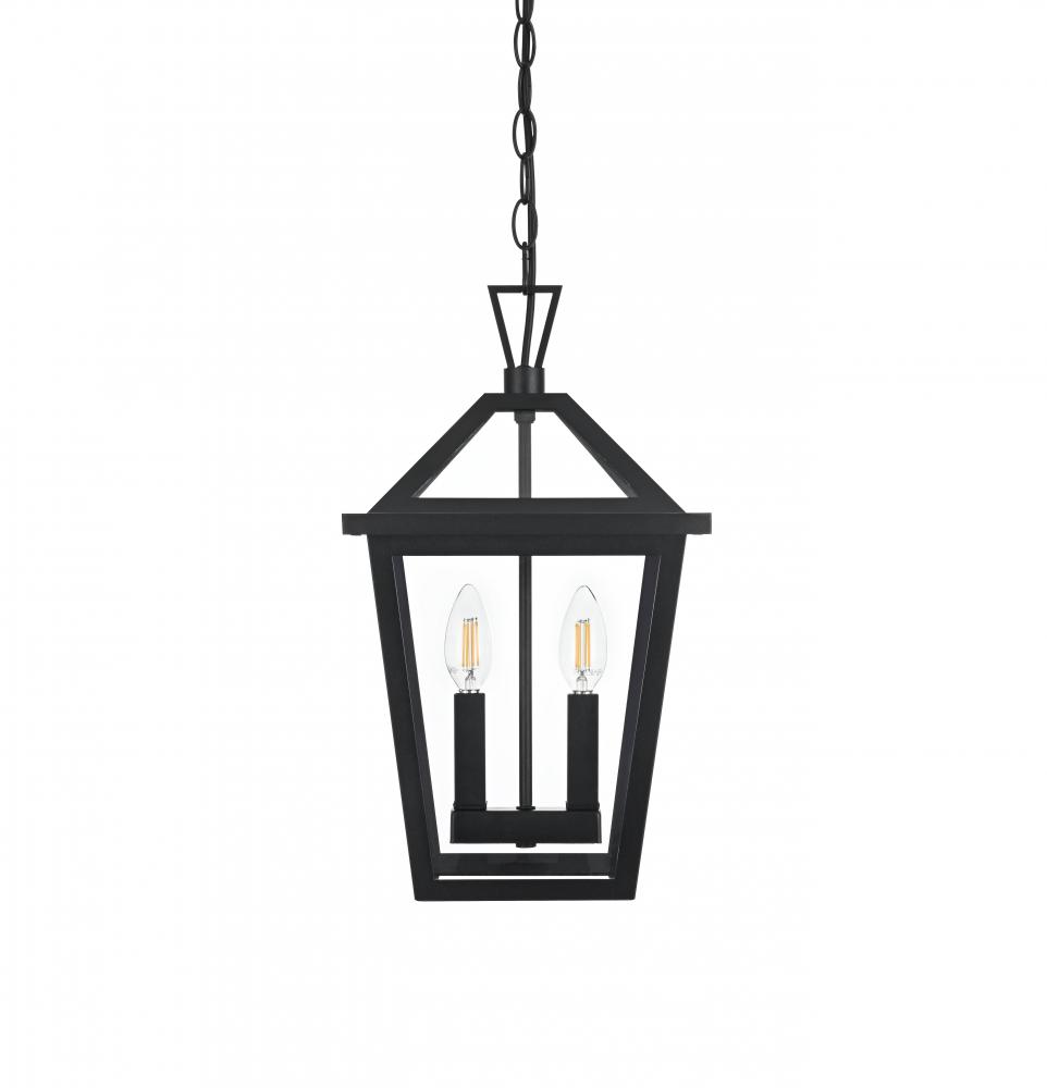 Introduce a classic and timeless glow to your outdoor space with this stunning lantern-style pendant light. Featuring a classic tapered frame and sophisticated matte black finish, this pendant light brings a refined, versatile aesthetic that enhances any home exterior, whether traditional or contemporary. with dual candelabra bulb holders, this pendant adds a vintage touch while ensuring bright, effective illumination. The tapered glass panels allow for maximum light output, creating a warm and inviting ambiance. Built from weather-resistant metal and ETL certified for wet locations, this pendant is crafted to withstand the elements while maintaining its beauty. Its adjustable chain allows for easy height customization, making it suitable for porches, patios, or entryways. Illuminate your home in style with this beautifully crafted outdoor pendant light.