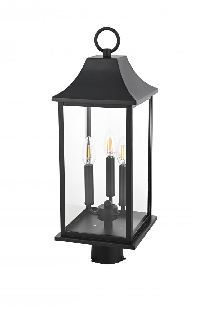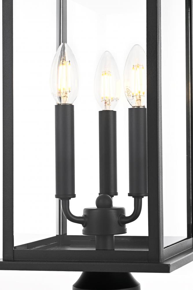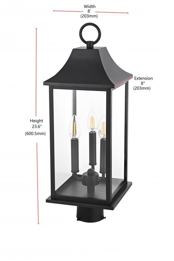 Transform your outdoor space with this expertly crafted outdoor post lantern. Made from sturdy iron and clear glass, it boasts a traditional square lantern shape with three candelabra-style bulbs, offering a warm glow. Its matte black finish complements any design, while the clear glass maximizes light output for a bright and inviting atmosphere. Weather-resistant and timeless, this lantern is the perfect addition to patios, gardens, or pathways.