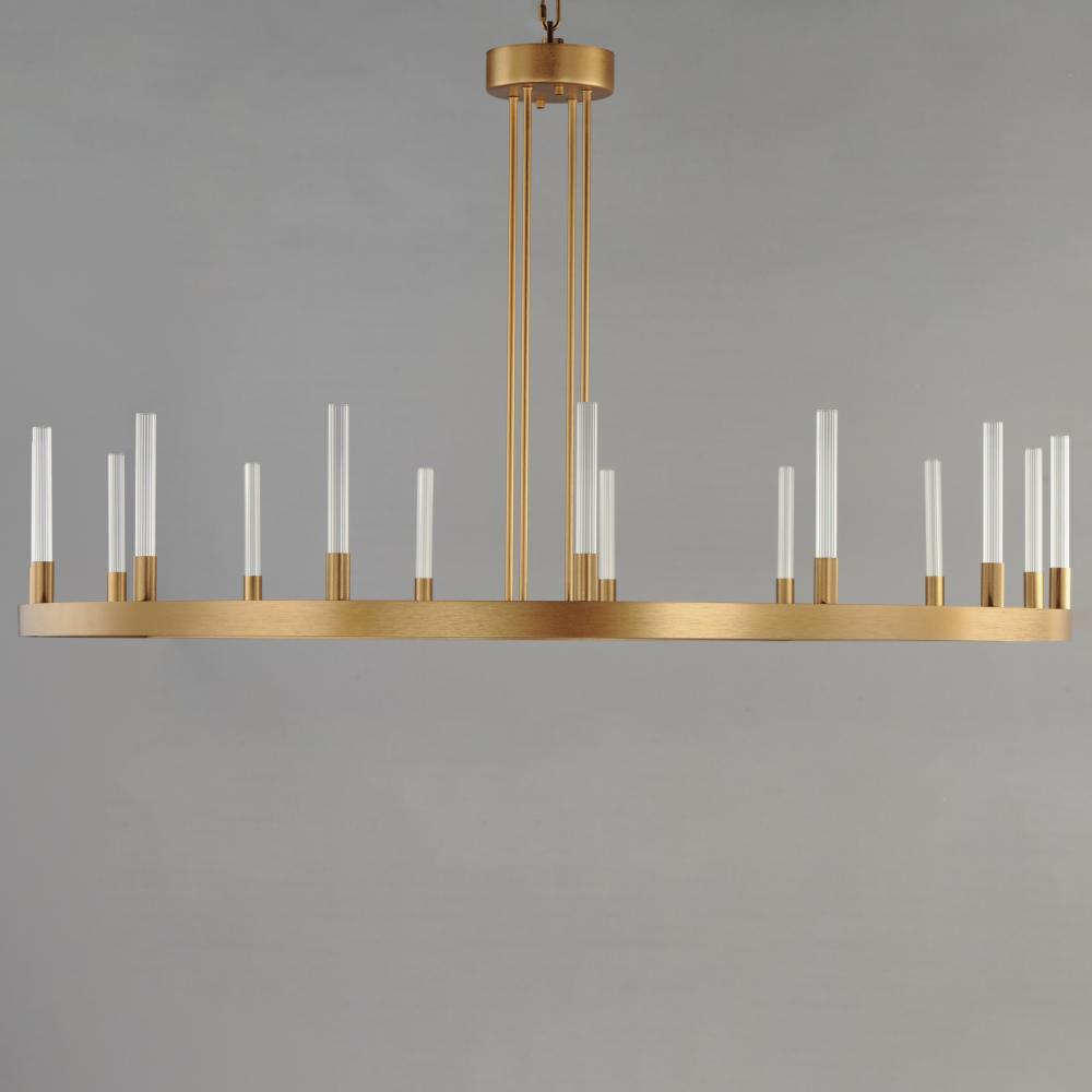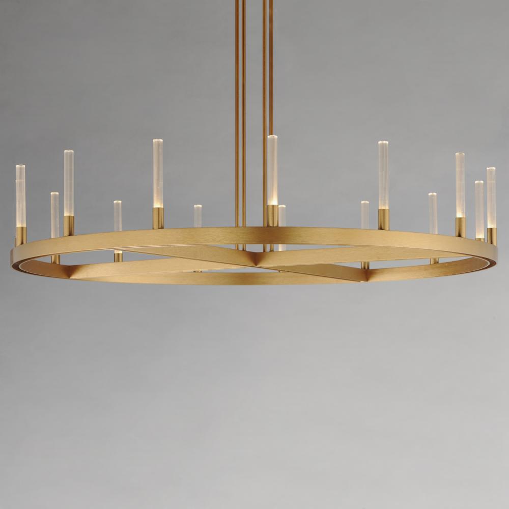 A modern tribute to the wheel chandelier, the Ovation collection integrates LED technology for a dazzling lighting effect. The LED light produces a shimmering lighting effect along the tall and narrow fluted glass shades adding celebratory effervescence. T