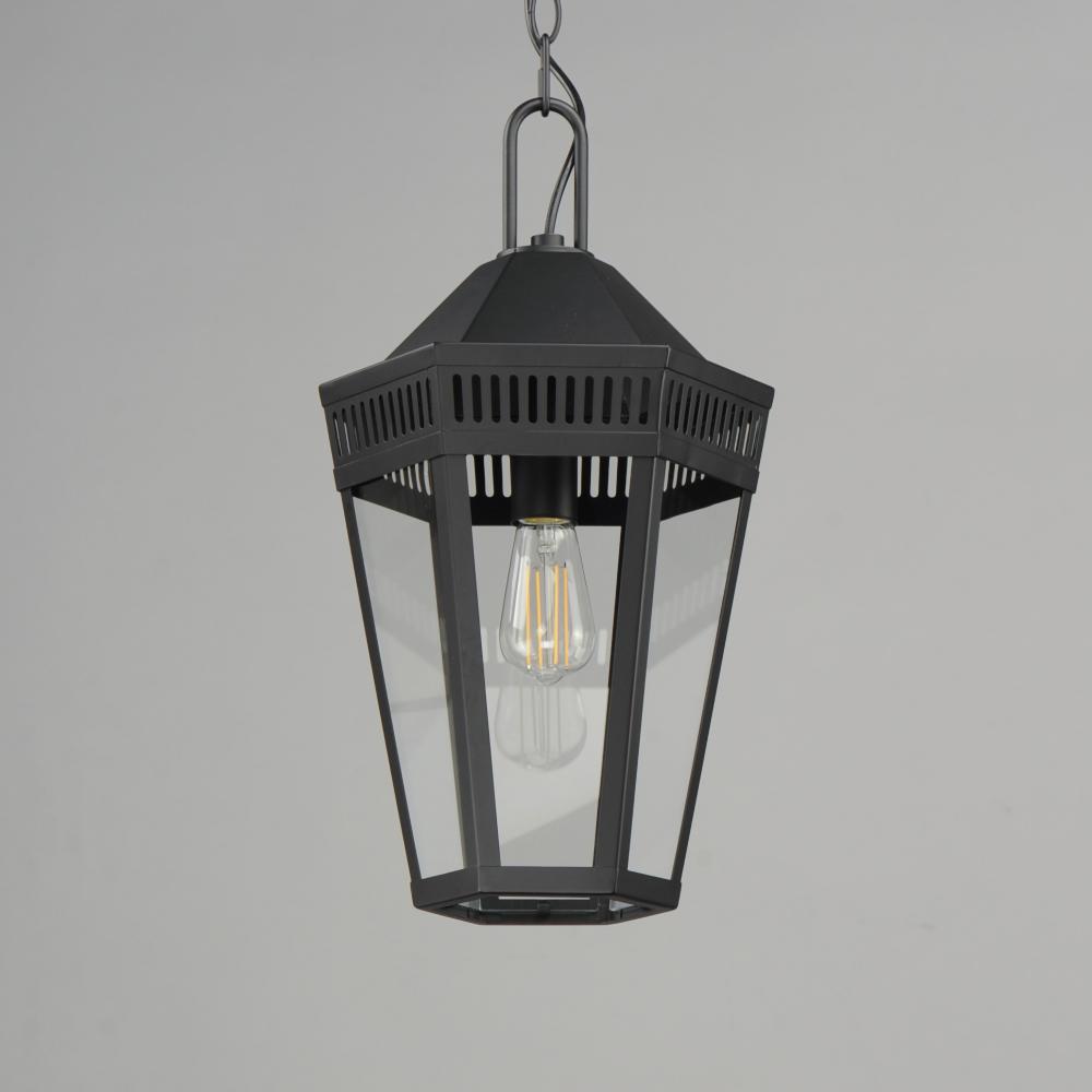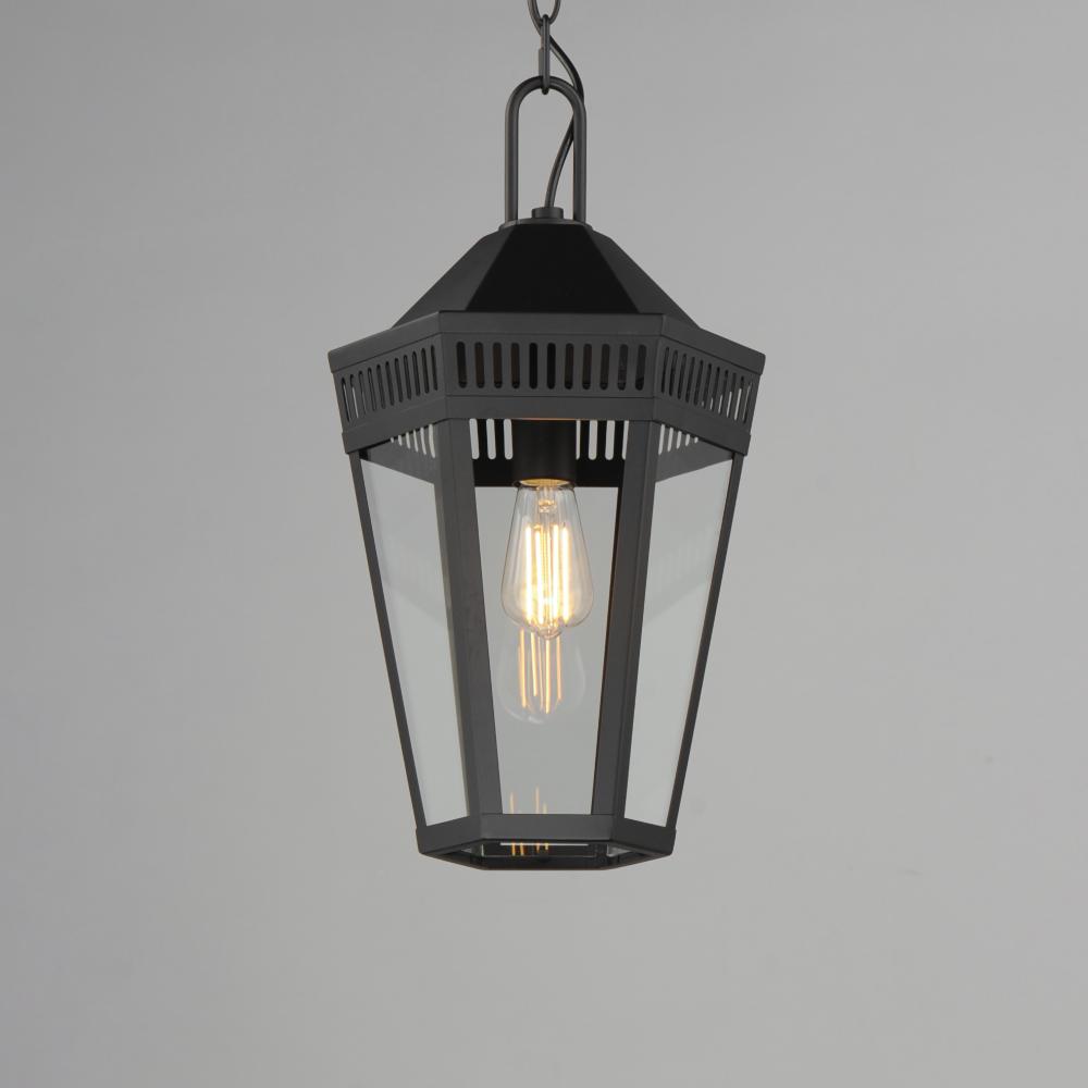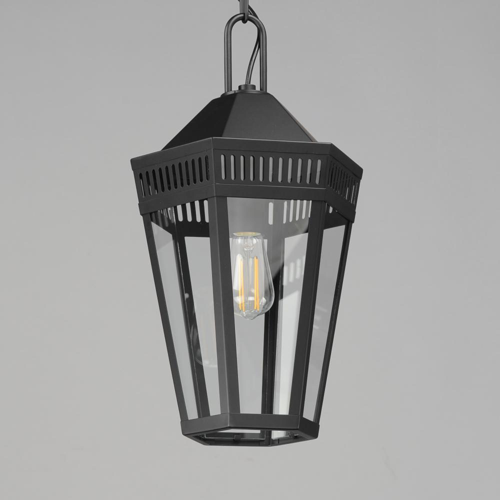 Stately lanterns with perforated filigree along the hood casts a beautiful lighting effect. Finished in Matte Black, the collection is available in multiple sizes as well as flush mount, deck lantern, and two sizes of pendants.