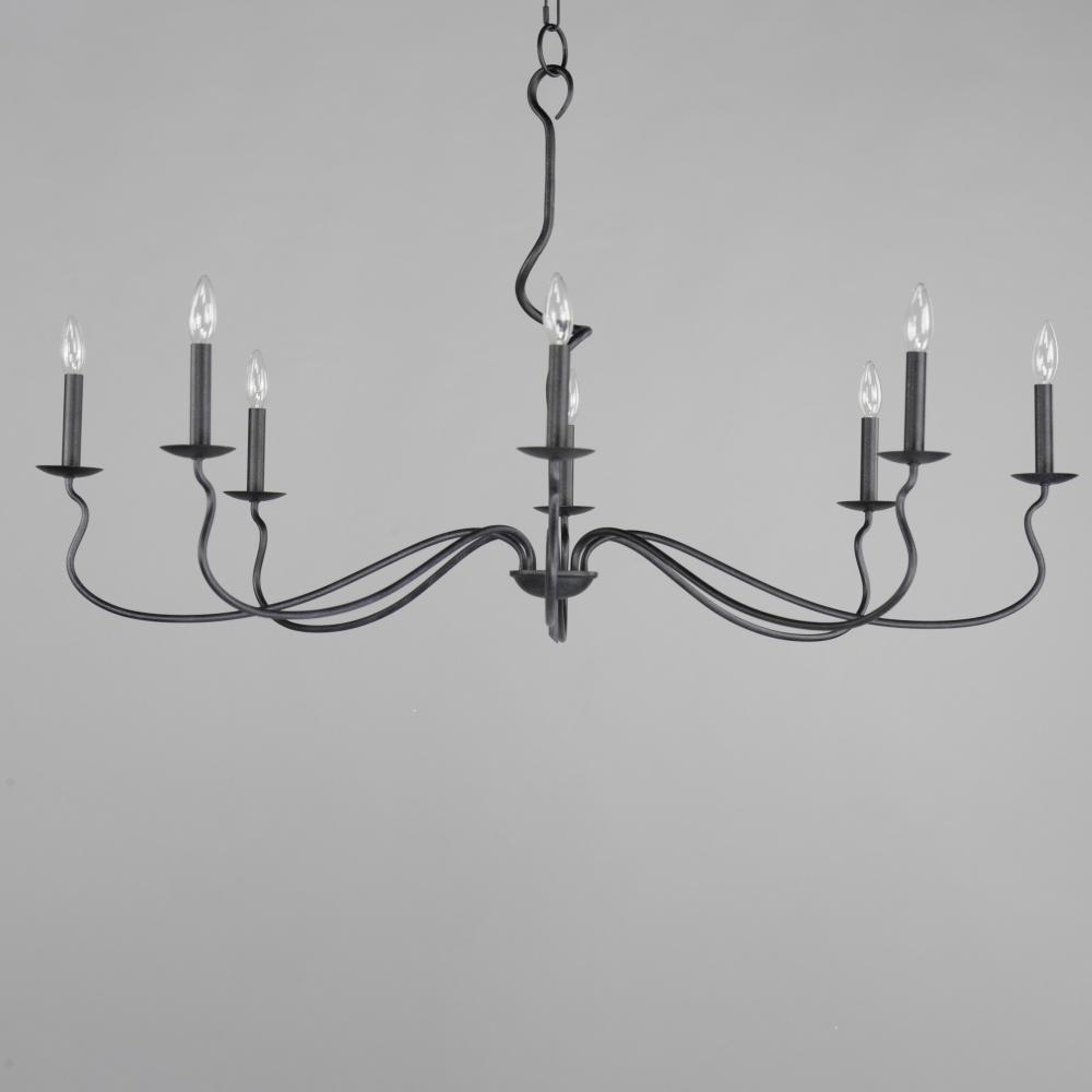 The sinuous form of thin arms outstretch and curve in a classic forged iron chandelier design. It seduces its audience with a wild turn at its center stem that ends with a charming hook detail replacing the conventional top loop. Completed in a Black Oxide