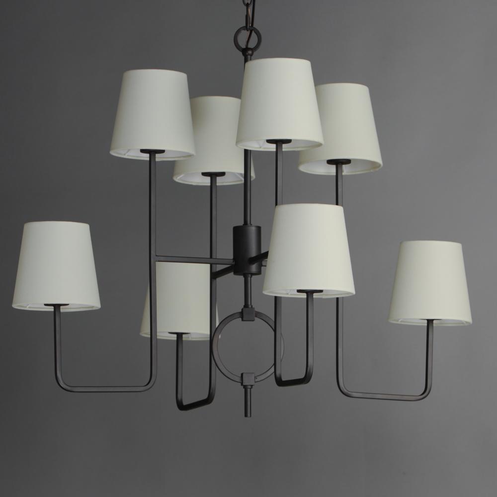 A clean frame with an oversized ring detail is finished in Charcoal Bronze. Featuring oversized Off-White Linen shades on two configurations of pendants, the collection also includes a two-tier chandelier and wall sconce.
