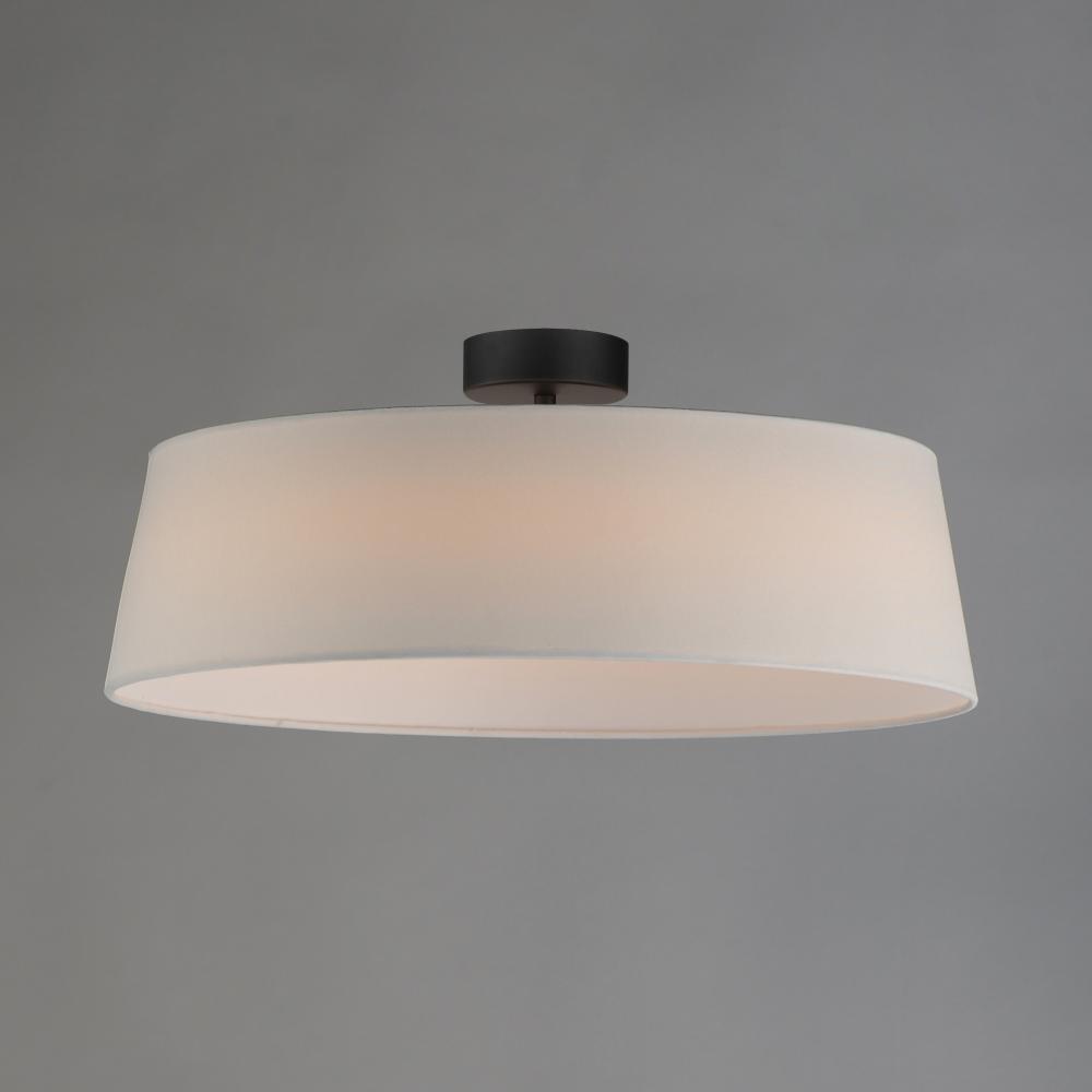 Truncated tapered cones of linen shades diffuse light from an LED ring within them. The LED lighting offers ample illumination that is softly diffused behind the shade. A two-pronged fork detail supports the ring within further modernizing this transitiona