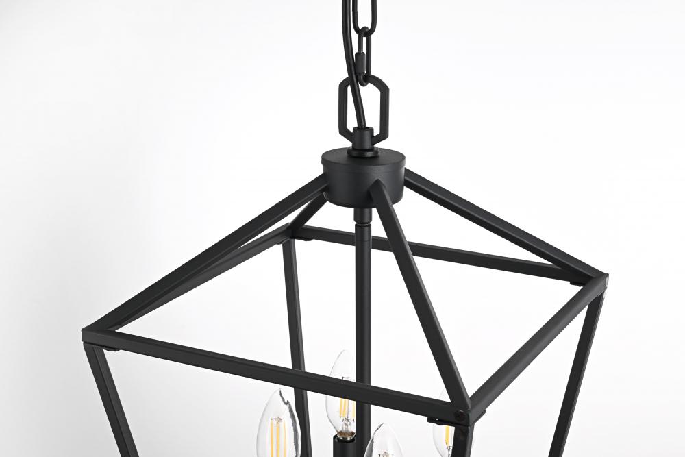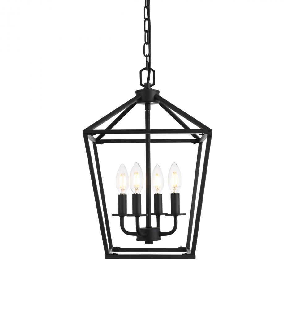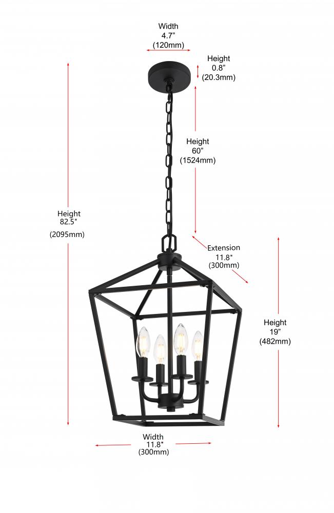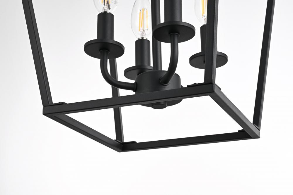 Add character and style to your indoor spaces with this bold pendant light. Crafted from sturdy iron with a geometric open-frame lantern design, it features four candelabra-style bulbs encased in clear glass panels for a bright and welcoming glow. The adjustable 60-inch chain provides versatile hanging options, making it ideal for entryways and indoor entertaining areas. Finished in matte black, this fixture combines durability with standout design, creating a statement piece that enhances any indoor setting. Available in three finishes—rustic white, wood-tone, and matte black—it complements a variety of interior aesthetics.