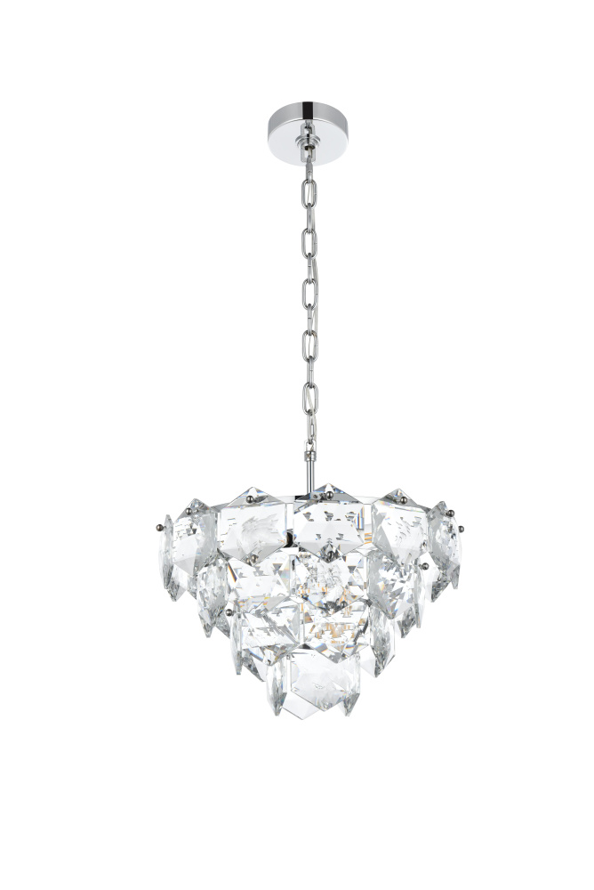 Transform your space with this cascading multi-tier pendant light that combines striking design with meticulous craftsmanship. Crafted from a sturdy iron frame and adorned with six-sided faceted crystals, this lighting piece exudes charm through its ability to diffuse light into a soft, radiant glow. With finishes available in both sleek chrome for a contemporary feel and satin gold for a warmer, refined touch, it complements a range of decor styles. The adjustable height, from 19 inches to 79 inches with the included 59-inch chain, ensures it fits seamlessly in any setting. Equipped with six E12 sockets and dimmable functionality, you can customize the lighting to suit your mood or occasion. Its matching canopy and chain finish complete the cohesive design, making it perfect for kitchens, dining rooms, living rooms, or offices. A statement piece that transforms your space into a work of art, this pendant is the perfect blend of style and functionality.