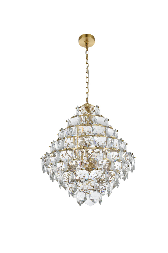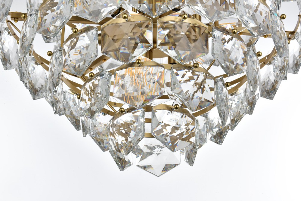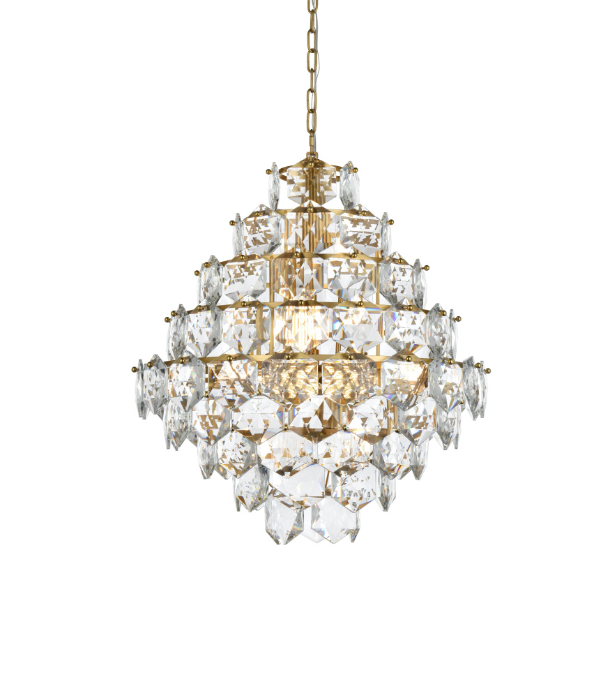 Adorned with six-sided, precision-cut crystals, each tier cascades down to create a radiant play of light and dimension.