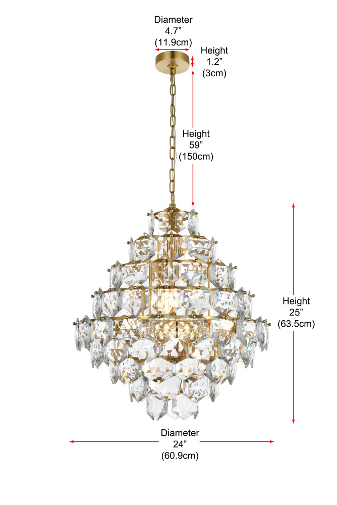 Transform your space with this cascading multi-tier pendant light that combines striking design with meticulous craftsmanship. Crafted from a sturdy iron frame and adorned with six-sided faceted crystals, this lighting piece exudes charm through its ability to diffuse light into a soft, radiant glow. With finishes available in both sleek chrome for a contemporary feel and satin gold for a warmer, refined touch, it complements a range of decor styles. The adjustable height, from 34 inches to 94 inches with the included 59-inch chain, ensures it fits seamlessly in any setting. Equipped with fifteen E12 sockets and dimmable functionality, you can customize the lighting to suit your mood or occasion. Its matching canopy and chain finish complete the cohesive design, making it perfect for kitchens, dining rooms, living rooms, or offices. A statement piece that transforms your space into a work of art, this pendant is the perfect blend of style and functionality.