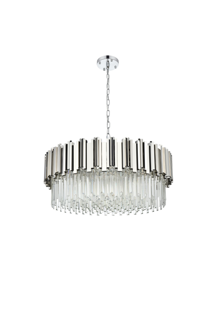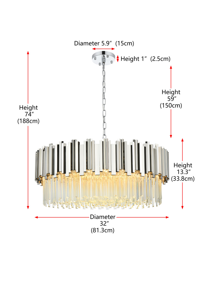 Transform your space with this stunning chandelier, a dynamic fusion of iron and staggered clear glass that exudes contemporary style and architectural artistry. The layered glass refracts light beautifully, creating a radiant display of glowing brilliance that fills the room with warmth and sophistication. The staggered arrangement of the metal and glass adds depth and dimension, making this chandelier an eye-catching centerpiece. Fully dimmable, it allows you to adjust the ambiance to suit any mood, from bright and vibrant to soft and inviting. Available in satin gold for a warm, luxurious vibe, chrome for sleek modernity, and black for bold, dramatic contrast, this fixture comes in various sizes to perfectly complement any space. Complete with a matching canopy, it’s an ideal choice for dining rooms, living rooms, or offices. Add a touch of refined geometry to your décor and bask in the brilliance of this radiant desi