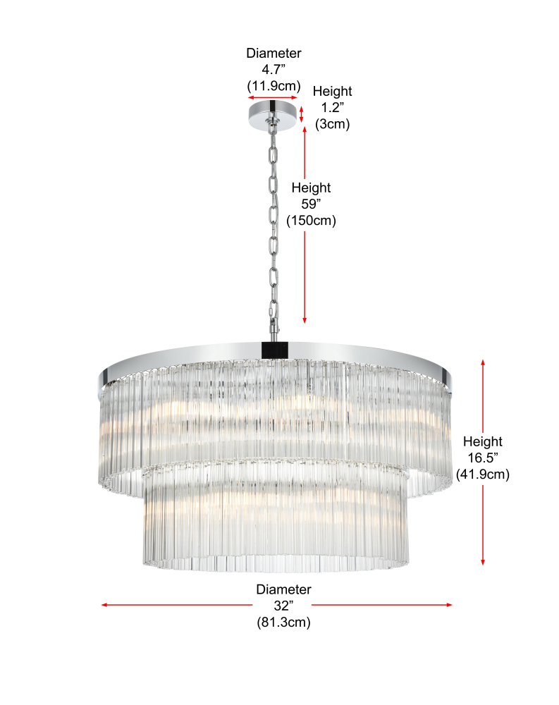 Turn your space into a glowing masterpiece with this striking pendant light, crafted from durable iron and shimmering clear ribbed glass. The cascading layers create a stunning interplay of light and shadow, refracting illumination into a radiant display that transforms your space into an illuminated work of art. Available in chrome for a sleek, contemporary aesthetic, black for bold contrast, and satin gold for an inviting warmth, this pendant light is as versatile as it is beautiful. Whether you choose a single tier for minimalist charm, two tiers for balanced depth, three tiers for bold presence, or four tiers for show-stopping grandeur, there’s an option for every setting. Featuring both round and rectangular frame designs, this fixture adapts to any space with ease. Complete with a matching canopy and chain, and fully dimmable for customized lighting, this pendant pairs perfectly with the coordinating single-tier flush mount and wall sconce collection, ensuring a cohesive, radiant design throughout youhome or office. Please note: light bulbs are sold separately.