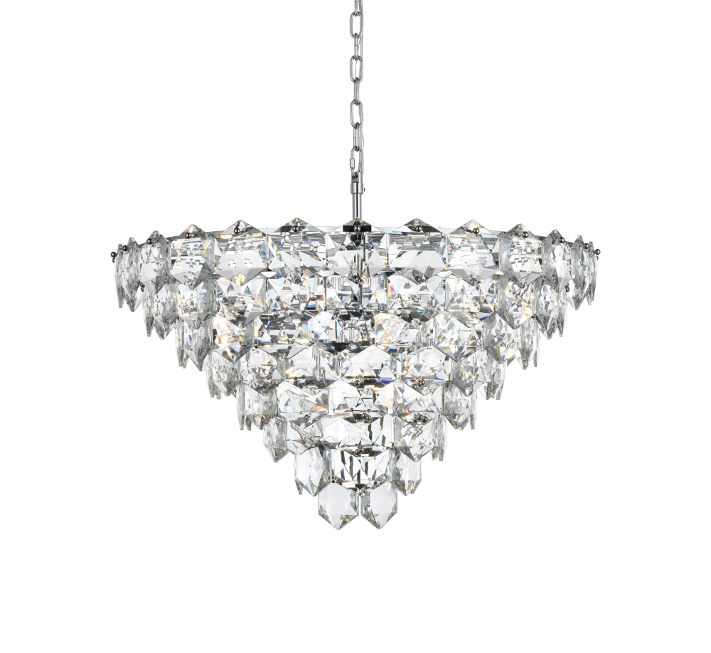 Features a stunning multi-tier arrangement of faceted crystals cascading down, creating a layered, dynamic visual effect that draws the eye and adds depth to any room.