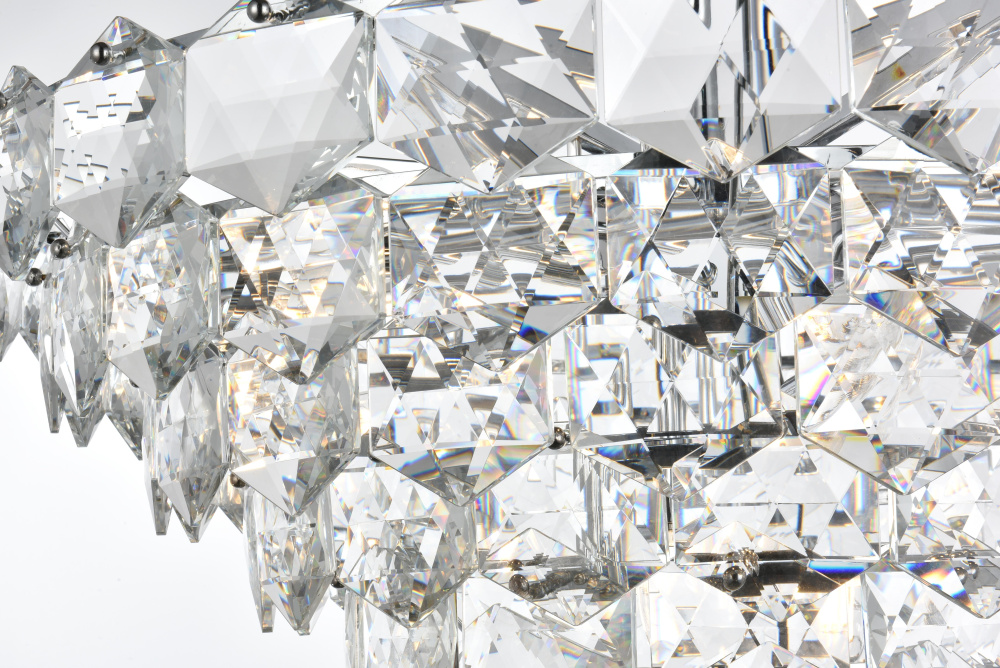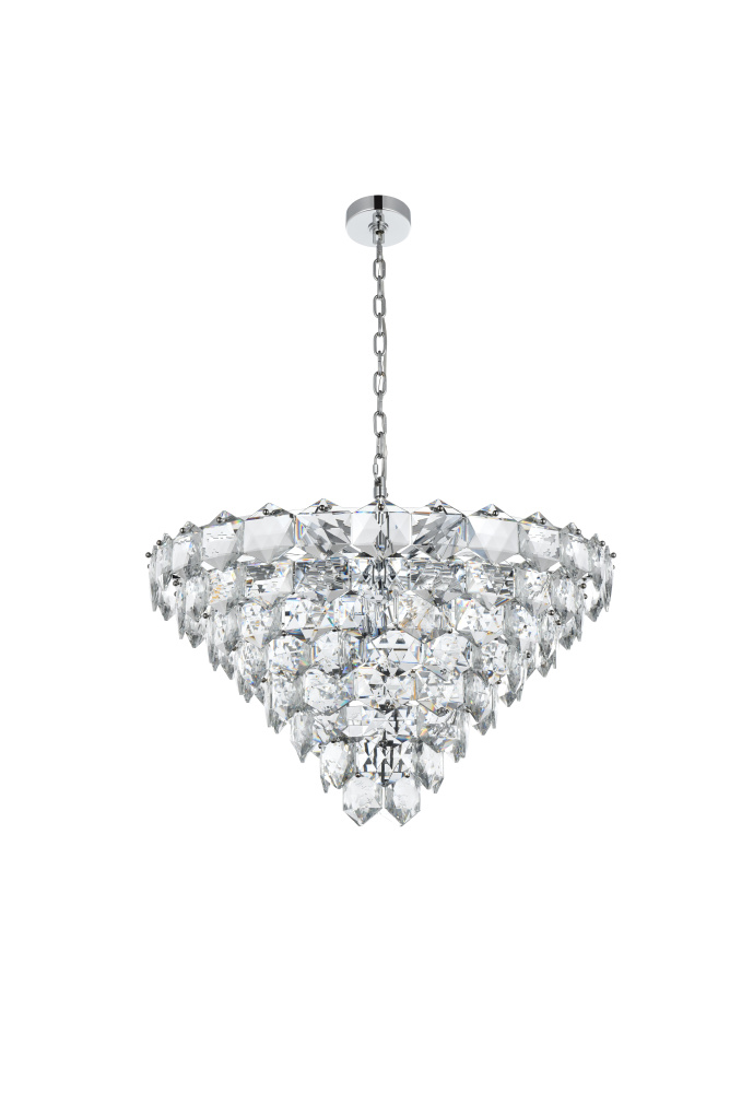 Transform your space with this cascading multi-tier pendant light that combines striking design with meticulous craftsmanship. Crafted from a sturdy iron frame and adorned with six-sided faceted crystals, this lighting piece exudes charm through its ability to diffuse light into a soft, radiant glow. With finishes available in both sleek chrome for a contemporary feel and satin gold for a warmer, refined touch, it complements a range of decor styles. The adjustable height, from 27 inches to 87 inches with the included 59-inch chain, ensures it fits seamlessly in any setting. Equipped with fifteen E12 sockets and dimmable functionality, you can customize the lighting to suit your mood or occasion. Its matching canopy and chain finish complete the cohesive design, making it perfect for kitchens, dining rooms, living rooms, or offices. A statement piece that transforms your space into a work of art, this pendant is the perfect blend of style and functionality.