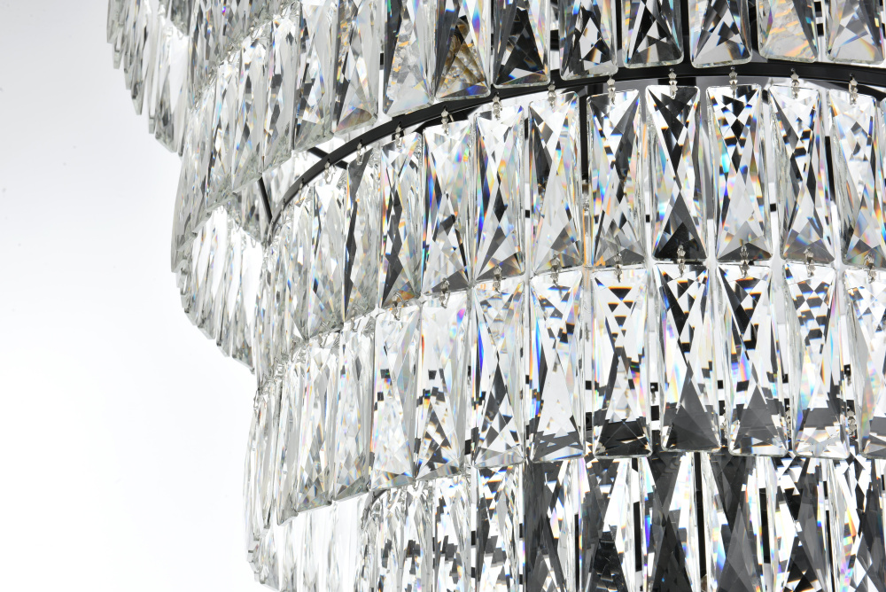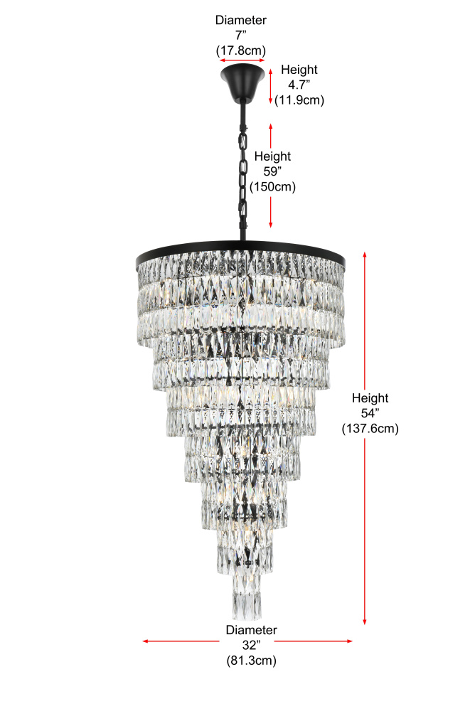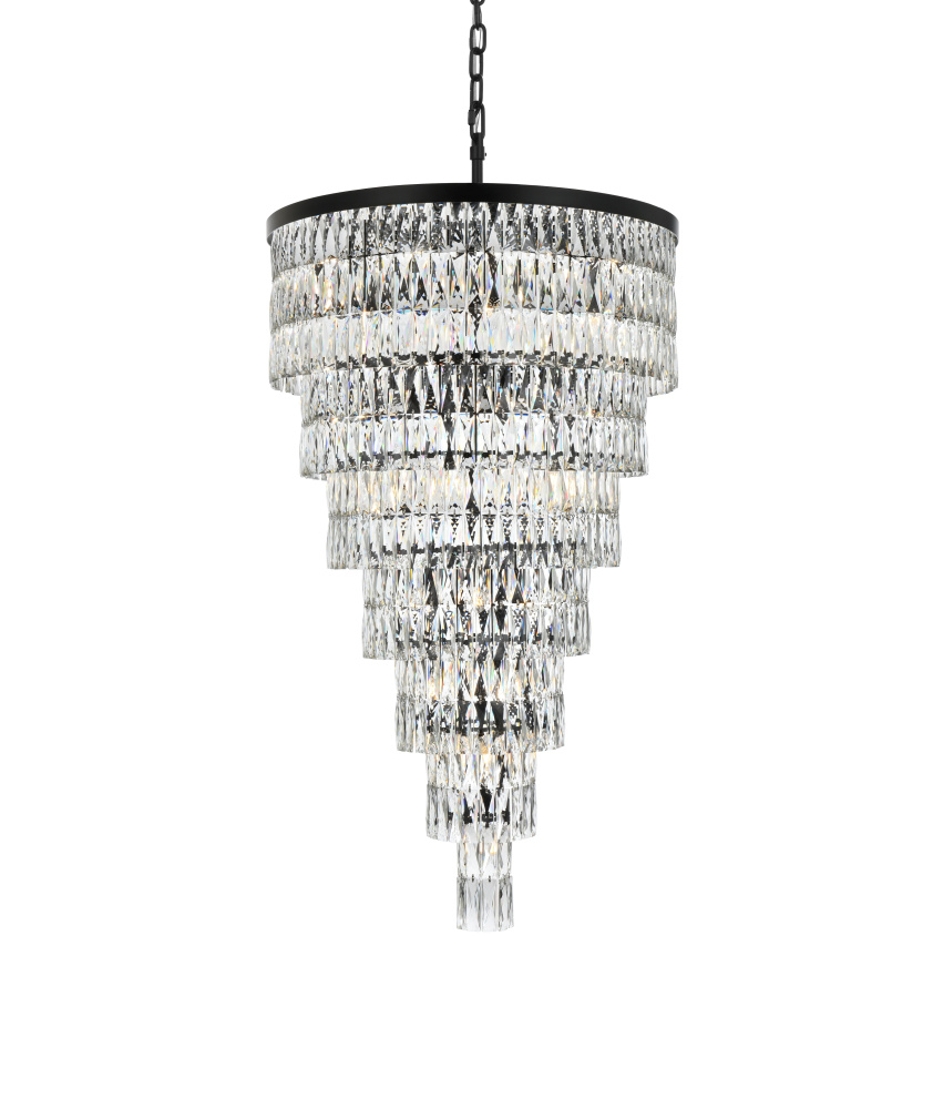 Transform your space with this extraordinary pendant that reimagines classical crystal design for contemporary interiors. The masterfully engineered silhouette features seven graduating tiers that create a spectacular inverted pyramid, reminiscent of a frozen cascade captured in mid-descent. Each precisely cut rectangular crystal is strategically positioned to maximize light play, creating mesmerizing displays of fractured light throughout your space. The substantial scale makes this fixture an ideal centerpiece for grand entryways, sophisticated dining rooms, or executive offices. The thoughtful construction incorporates 41 light sources distributed throughout the tiers, ensuring both spectacular illumination and enchanting crystal animation. The robust iron framework provides a secure foundation while maintaining visual lightness, allowing the crystals to appear as if floating in space. Available in reflective chrome, sophisticated black, or warm satin gold, this pendant makes an unforgettable statement while maintaining refined restraint. The cascading arrangement creates a sense of movement and flow, while the geometric precision of each crystal adds contemporary edge to the classical form. This is more than a light fixture – it's an architectural feature that transforms your space through its commanding presence and spectacular light performanc