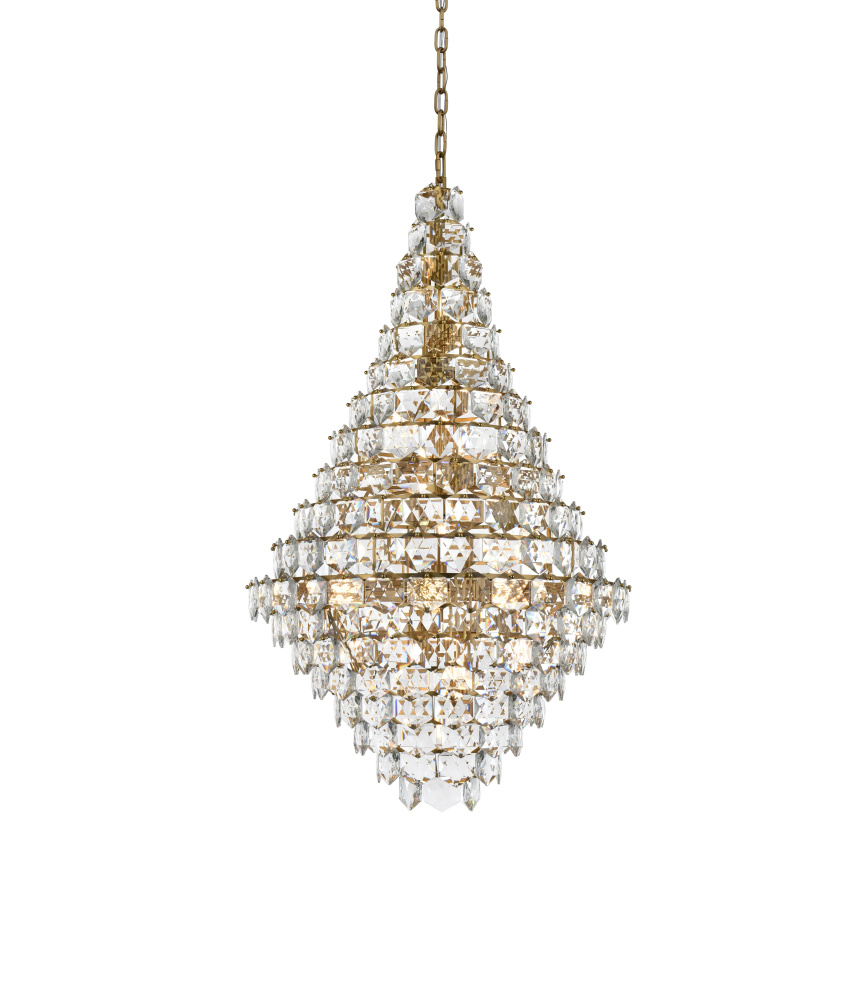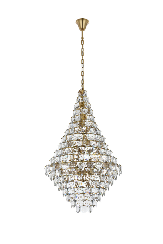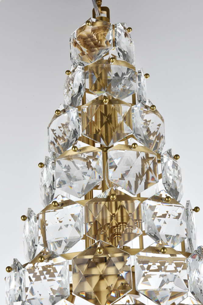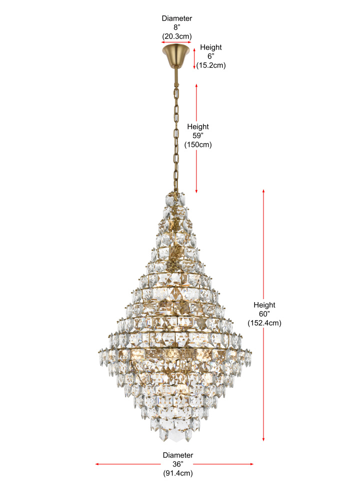 Make a bold statement with this stunning teardrop-shaped pendant light that combines architectural form with radiant details. The cascading multi-tier arrangement of six-sided faceted crystals creates a dazzling visual effect, beautifully diffusing light to enhance the ambiance of any room. Built with a durable iron frame and available in chrome for a sleek, contemporary edge or satin gold for a rich, inviting tone, this lighting fixture complements a range of decor styles. Its grand adjustable hanging height—from 75 inches to 135 inches—makes it ideal for spaces with high ceilings. With 38 E12 sockets (bulbs sold separately) and dimmable compatibility, it provides versatile lighting options tailored to your needs. The matching canopy and chain finish complete its cohesive design. Whether placed in a dining room, living room, office, or a grand foyer, this chandelier-style pendant transforms any space into a brilliant masterpi
