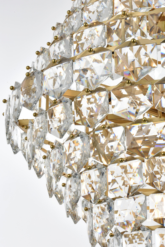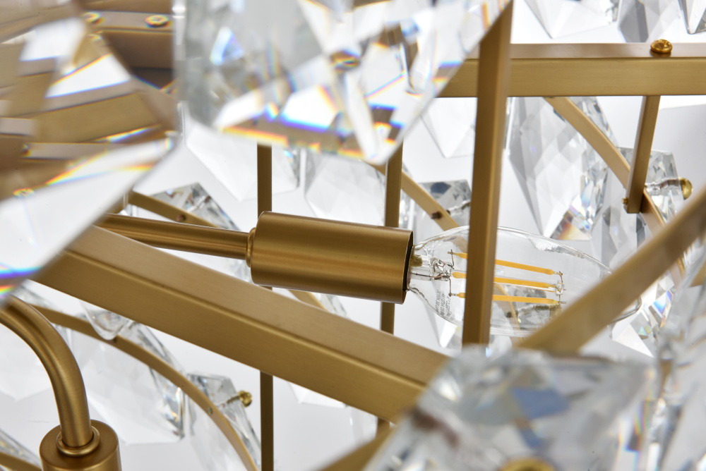 Each crystal is six-sided, expertly cut to diffuse light beautifully and create a soft, radiant glow throughout the room.