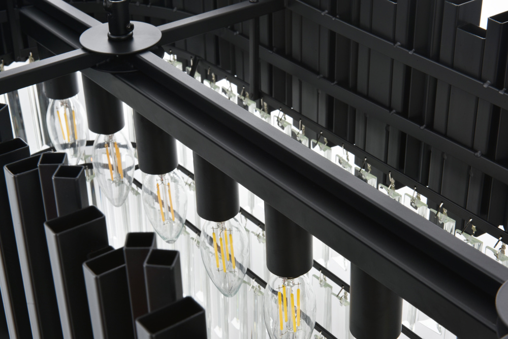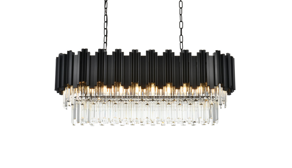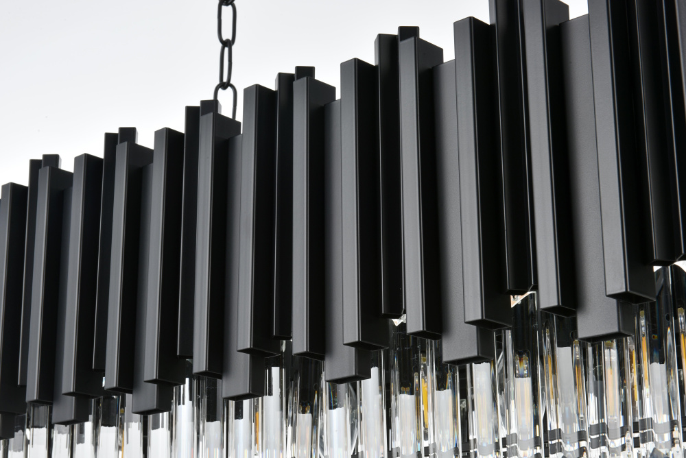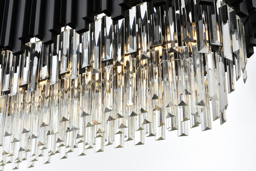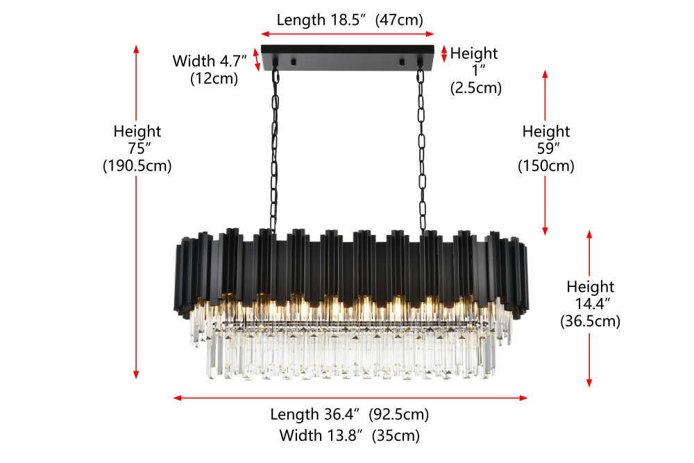 Make a bold statement with this stunning rectangular chandelier, where modern geometry meets luminous artistry. Featuring a sturdy iron frame with a staggered design and cascading clear glass accents, this fixture refracts light into a dazzling array of brilliance, creating a dynamic interplay of light and shadow. The dramatic black finish complements the shimmering glass, emphasizing the sleek, contemporary design. Perfect for dining rooms, spacious living areas, or professional settings, this chandelier transforms any space into a radiant centerpiece. Fully dimmable, it allows you to customize the ambiance to suit any occasion. Complete with a matching canopy and easy installation, this chandelier redefines modern lighting with its bold structure and captivating glow.