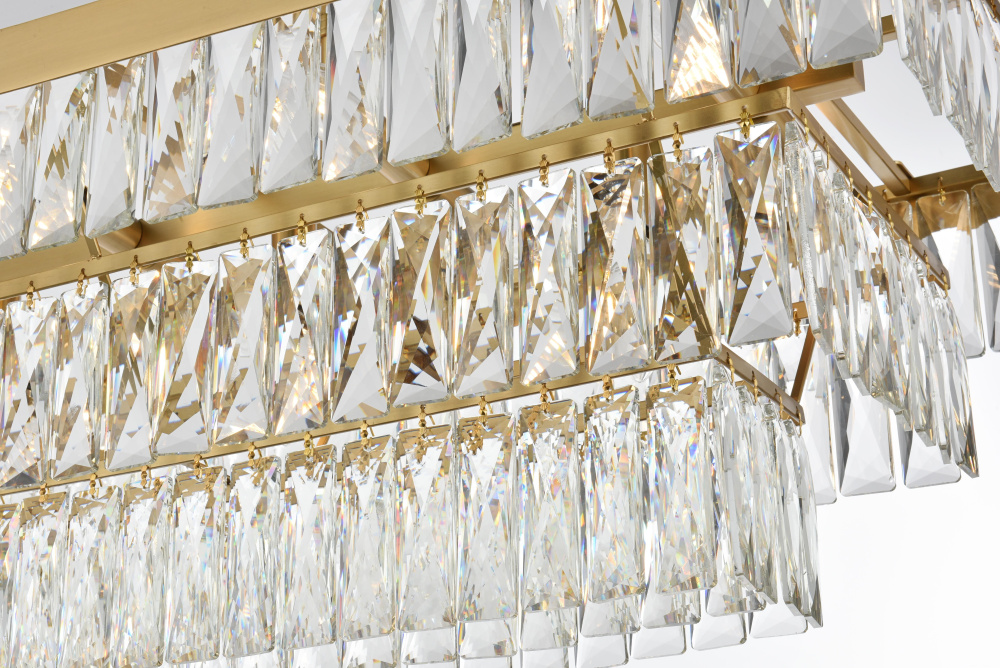 Transform your space with this spectacular linear pendant that reinvents crystal lighting for contemporary interiors. The bold rectangular frame suspends two perfectly proportioned crystal tiers, creating a mesmerizing interplay of light and structure. Each precisely cut crystal is strategically positioned to maximize light play, producing brilliant refractions that dance across your space. The strong horizontal presence makes this fixture an ideal centerpiece above dining tables, conference rooms, or in grand living spaces. The thoughtful construction marries industrial strength with crystalline delicacy, as the robust metal frame appears to float above while supporting the spectacular crystal arrangement. Whether styled in reflective chrome, sophisticated black, or warm satin gold, this pendant commands attention through its architectural presence. The linear composition offers a fresh interpretation of crystal lighting, where clean lines and geometric precision meet the spectacular light performance of premium crystal. This fixture doesn't merely illuminate – it defines space through its commanding horizontal presence while creating an ever-changing display of light and shado