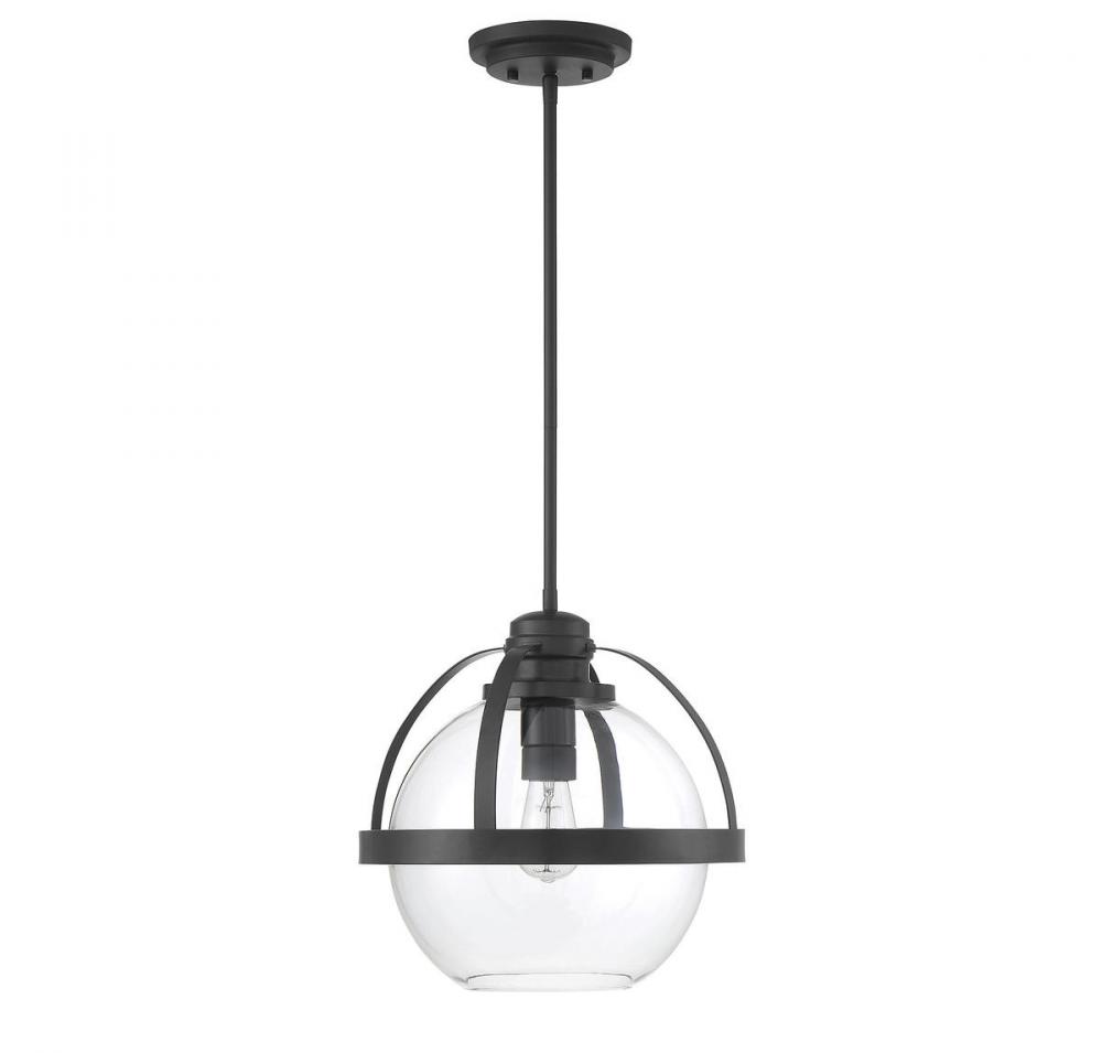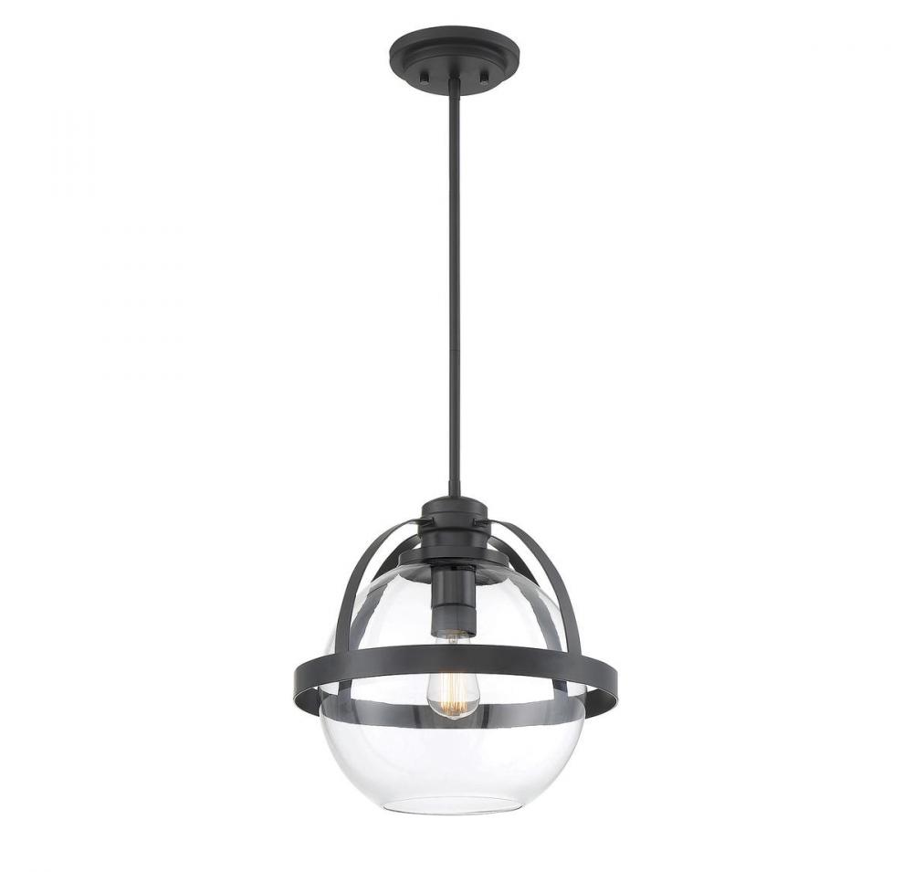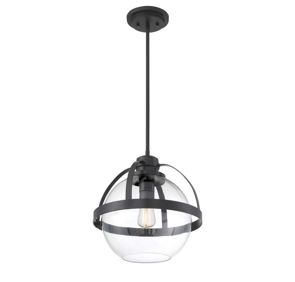 This Savoy House Pendleton 1-light pendant is a smart way to pep up the illumination and style in any room. It showcases a large orb of clear glass that isopen at the bottom, allowing for more direct light and making it easy to replace the bulb. Metal bands bisect the shade and help hold it to the fixtureï¾’s base. Try using this fixture in kitchens, foyers, bedrooms and home offices, though truly the possibilities are endless. Finished in matte black. This fixture is 14" wide and has an adjustable height that ranges from 14" to 45.5". Uses a standard size bulb of up to 60 watts (not included).