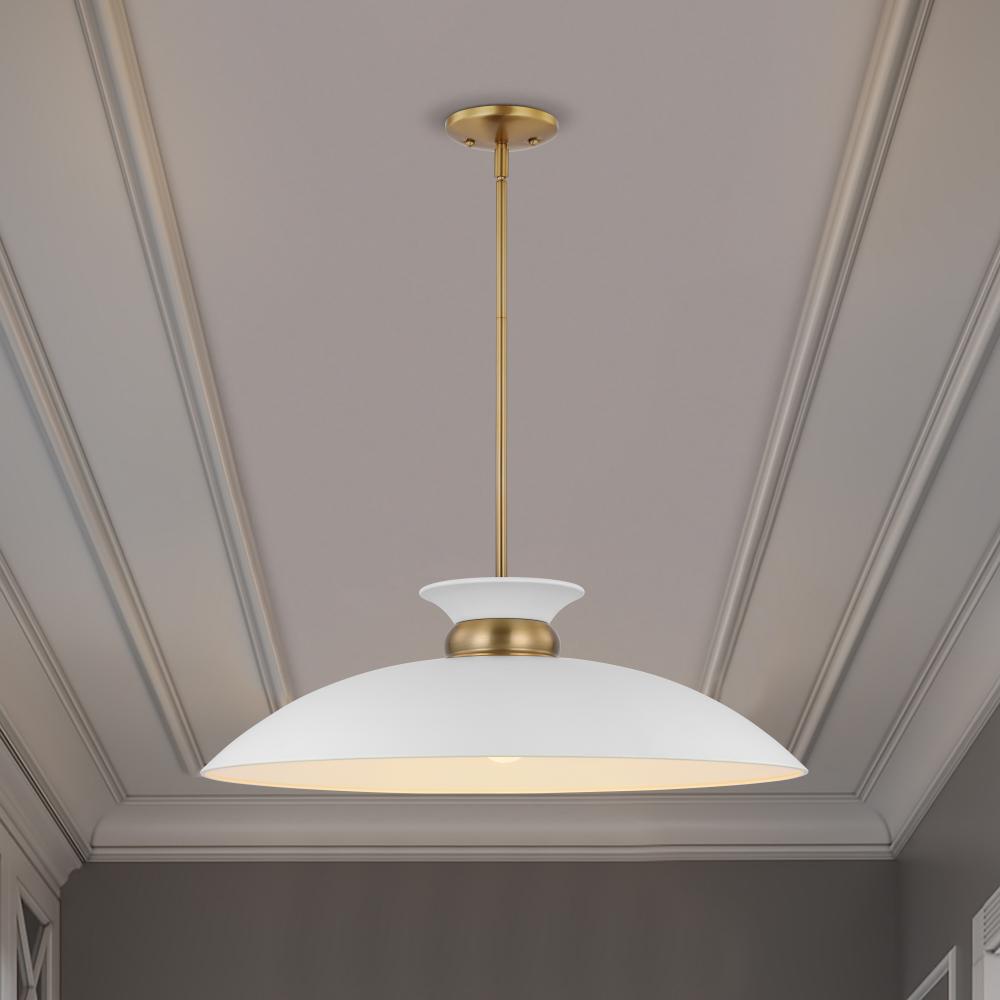 The simplistic design of the Perkins 60-7465 large pendant is understated, yet refined. The decorative burnished brass band on the shallow-dome metal shade cinches at the top, creating the illusion of a swirling skirt. The white interior of the shade provi
