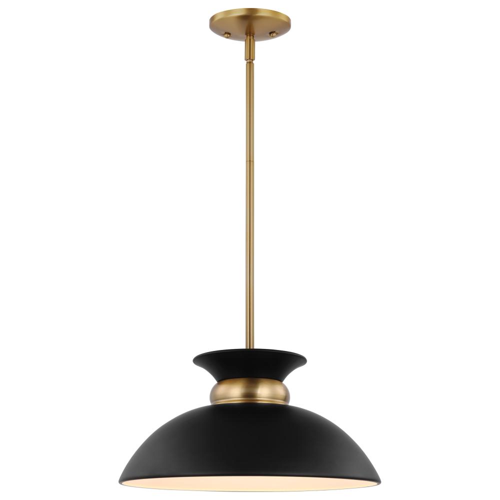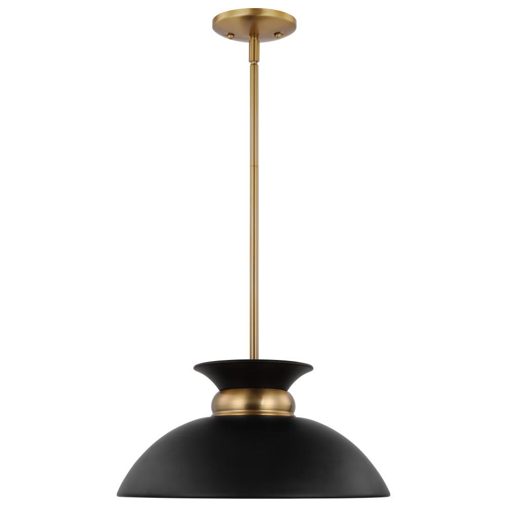 The simplistic design of the Perkins 60-7460 small pendant is understated, yet refined. The decorative burnished brass band on the shallow-dome metal shade cinches at the top, creating the illusion of a swirling skirt. The white interior of the shade provi
