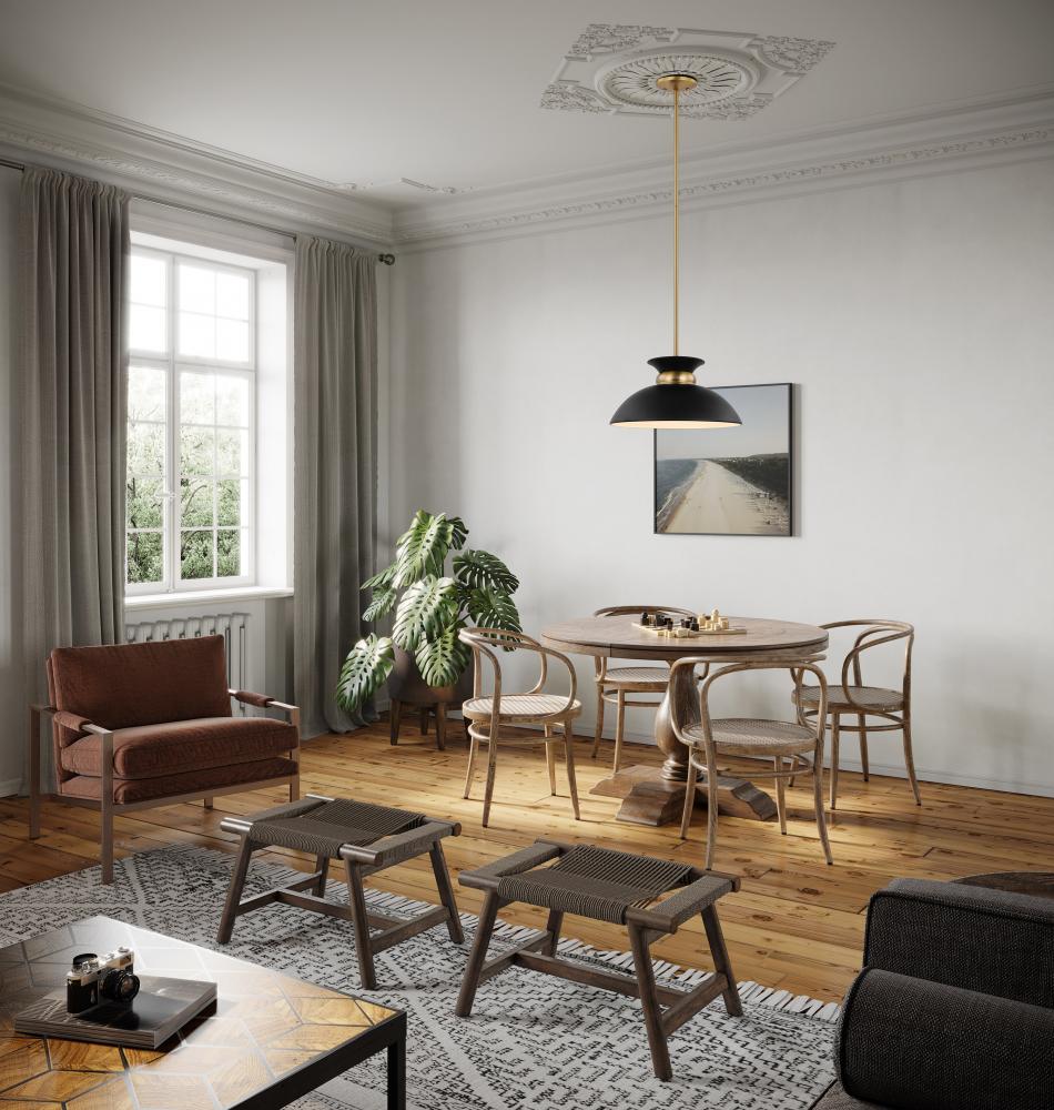 The simplistic design of the Perkins small pendant is understated, yet refined. The decorative burnished brass band on the shallow-dome metal shade cinches at the top, creating the illusion of a swirling skirt. The white interior of the shade provides maxi