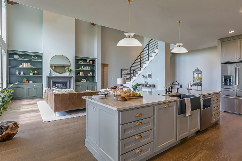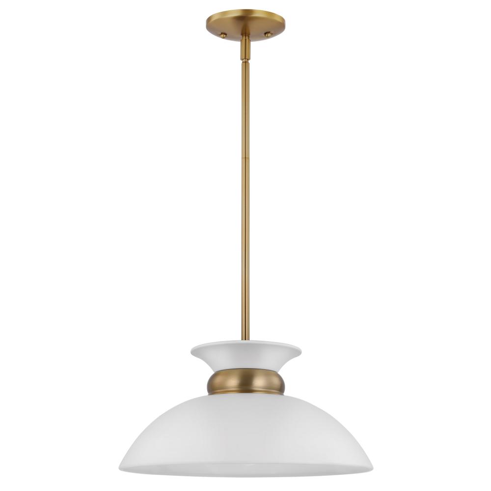 The simplistic design of the Perkins 60-7463 small pendant is understated, yet refined. The decorative burnished brass band on the shallow-dome metal shade cinches at the top, creating the illusion of a swirling skirt. The white interior of the shade provi