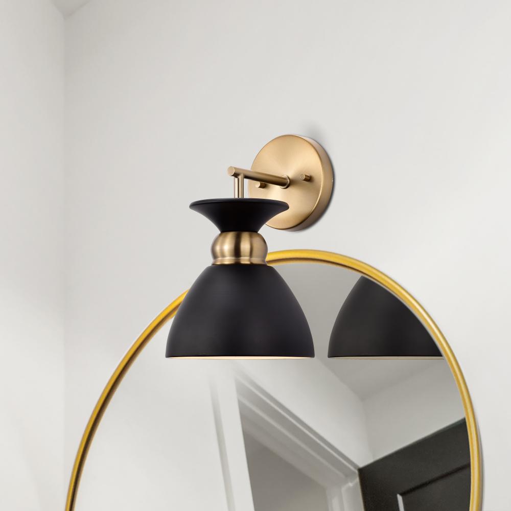 The simplistic design of the Perkins 60-7458 wall sconce is understated, yet elegant. The decorative burnished brass band on the shallow-dome metal shade cinches at the top, creating the illusion of a swirling skirt. The white interior of the shade provide